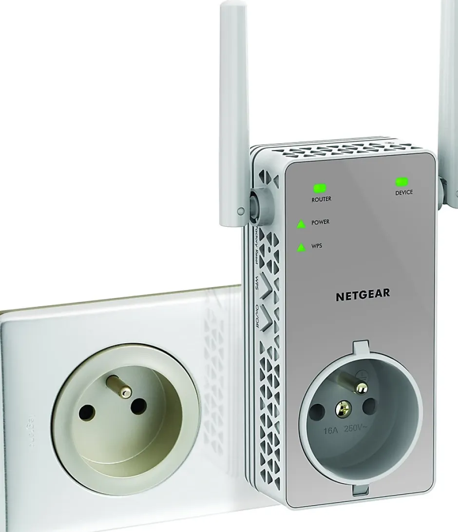 Répéteur WIFI Netgear EX3800 AC750Le répéteur Wi-Fi AC NETGEAR amplifie le Wi-Fi signal existant de votre point d’accès ou de votre Box ADSL et augmente sa portée. Il offre des connexions Wi-Fi Dual Band atteignant des vitesses allant jusqu’à 750 Mbps. Il fonctionne avec tous les routeurs WiFi, quelque soit la marque et toutes les box ADSL quelque soit le fournisseur d’accès Internet . Il est idéal pour les flux vidéo HD en streaming et les jeux en ligne. Vous pourrez également connecter vos tablettes, vos smartphones, vos ordinateurs portables et bien plus. Grâce au mode point d’accès en branchement direct sur votre box, faites évoluez la puissance et la portée de votre box internet à la norme WiFi 802.11AC pour tous vos appareils. Spécifications : – Facilité d’installation : Pas besoin de CD d’installation, La fonctionnalité Push +N+ Connect utilise la technologie WPS (Wi-Fi Protected Setup) – Standards IEEE 802.11 b/g/n 2.4GHz et IEEE 802.11 a/n/ac 5GHz – 1 port Ethernet 10/100 Mbps équipé de la technologie auto-sensing – Dimensions : 144 x 64 x 44.5 mm – Poids : 192 g