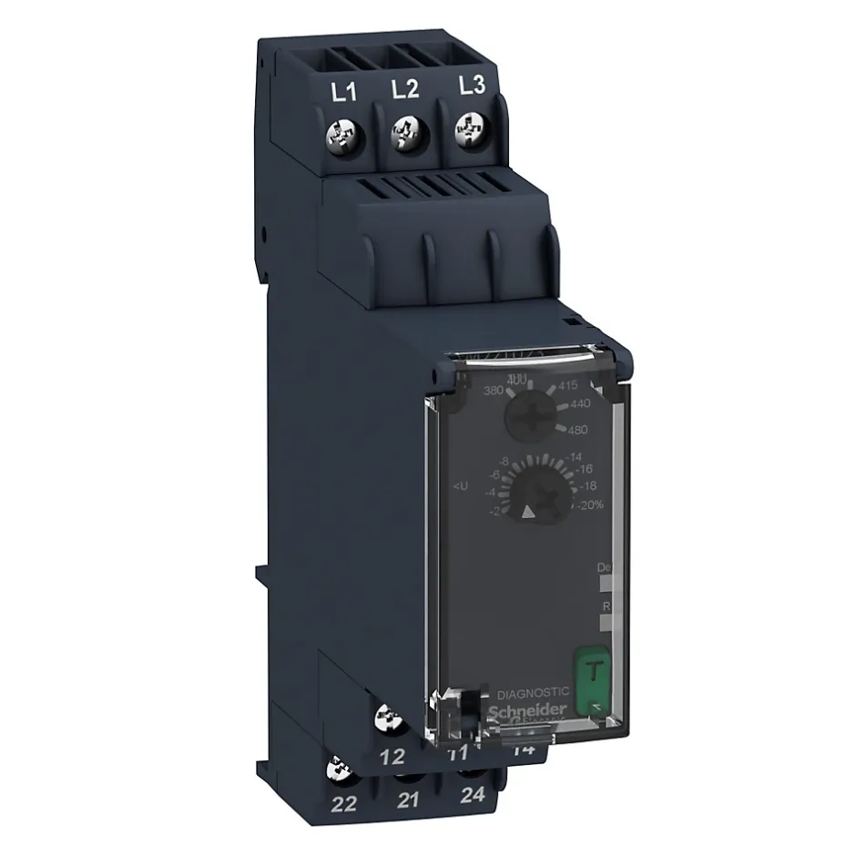 Relais de contrôle de phase 8A – 2OF (inverseur) – Zelio Control – Schneider RM22TU23Ce relais fabriqué par Schneider Electric fait partie de la gamme Zelio Control, destinée aux besoin industriels. Il permet le contrôle de réseaux triphasés.Le relais est équipé de contacts 2OF (inverseur) et d’une plage de mesure 380 à 480Vca. De format modulaire le relais RM22TU23 s’installe sur le rail DIN de votre armoire électrique.Les fonctions du relais de contrôle de phases RM22TU23Séquencement des phases (ordre des phases L1, L2, L3) Absence de phaseSous-tension