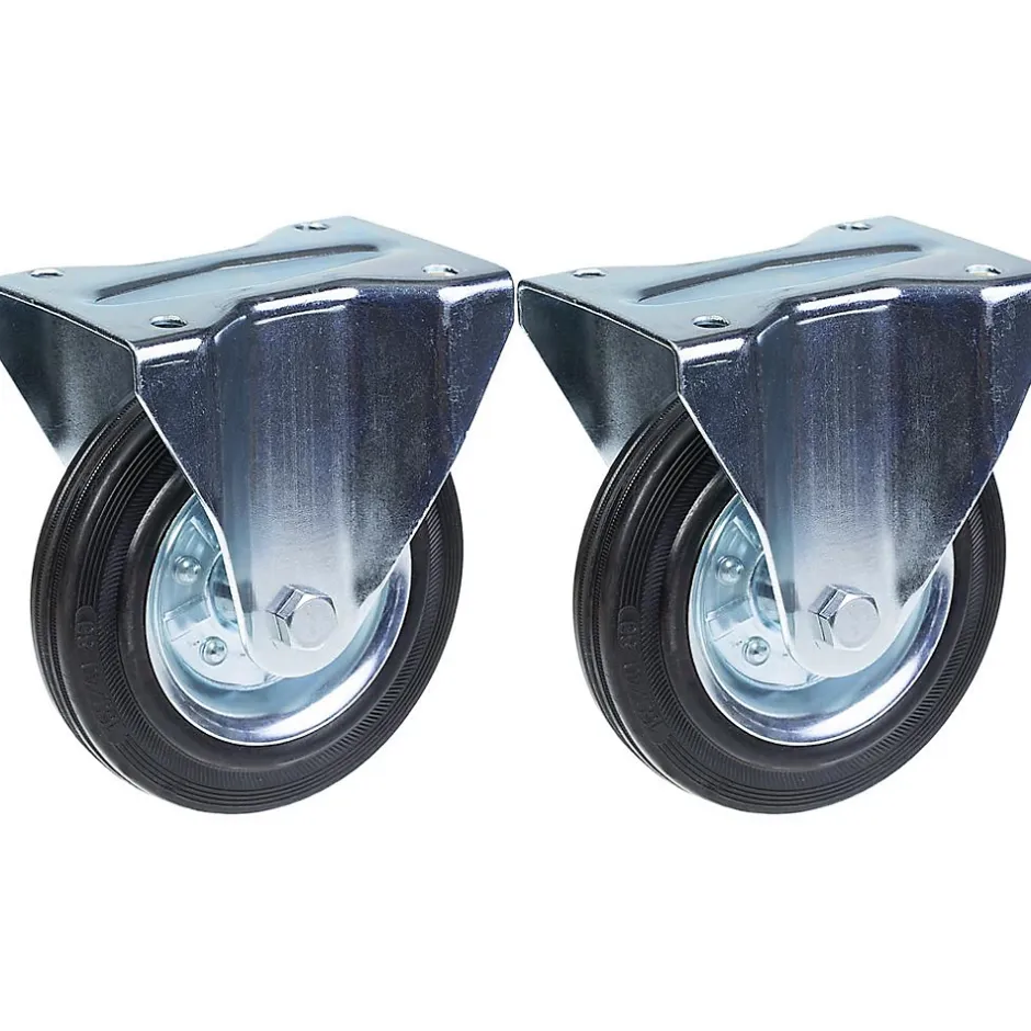 Jeu de 2 roulettes en caoutchouc noir de 160 mm avec plaque supérieure.Ces 2 roulettes fixes ont des roues en caoutchouc noir avec des centres en acier pressé.Les dimensions de l’article sont les suivantes :Diamètre de la roue : 160mmLargeur de la bande de roulement : 39mmRoulement de roue : Roulement à rouleauxTaille de la plaque supérieure : 146x107mmCentre des trous de montage : 105x80mmTaille des trous de montage : 11 mmHauteur totale : 193 mmCapacité de charge : 150 kg par roulette (300 kg par jeu).Dureté de la bande de roulement 85° Shore A.Résistance au roulement raisonnable, faible bruit de fonctionnement et très bonne préservation des sols.Bonne résistance chimique, sauf aux huiles.