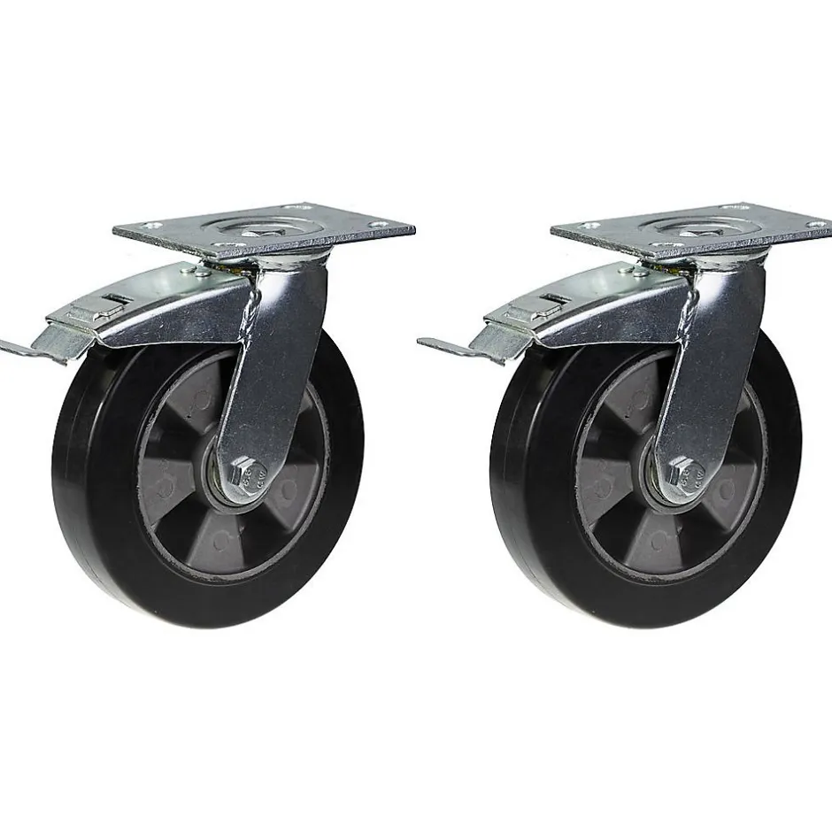 Jeu de 2 roulettes en caoutchouc élastique noir de 200 mm avec plaque supérieure et pieds en fourche soudés.Ces 2 solides roulettes pivotantes avec frein ont des roues en caoutchouc élastique noir avec des centres en aluminium et des roulements à billes.Le frein bloque le pivot et la roue en même temps.Les dimensions de l’article sont les suivantes :Diamètre de la roue : 200mmLargeur de la bande de roulement : 50mmRoulement de roue : Roulements à billesTaille de la plaque supérieure : 140x110mmCentre des trous de montage : 105x80mmTaille des trous de montage : 11 mmHauteur totale : 236 mmCapacité de charge : 450 kg par roulette (900 kg par jeu)Dureté de la bande de roulement 75° Shore A.Faible résistance au roulement, faible bruit de fonctionnement et très bonne préservation des sols.La grande élasticité du caoutchouc permet à la roue de reprendre sa forme ronde plus rapidement, en évitant les méplats, et donne donc une résistance au roulement inférieure à celle d’un caoutchouc de qualité standard.Bonne résistance chimique, sauf aux huiles.