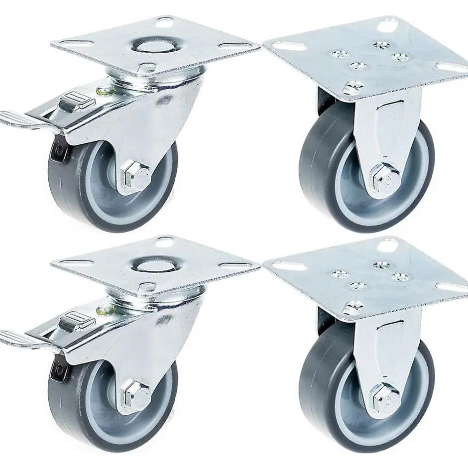 Jeu de 4 roulettes en caoutchouc gris de 50 mm avec plaque supérieure.Ces 2 roulettes pivotantes avec frein et 2 roulettes fixes ont des roues en caoutchouc thermoplastique solide gris avec un centre en plastique.Le frein bloque à la fois le pivot et la roue.Les dimensions de l’article sont les suivantes :Diamètre de la roue : 50 mmLargeur de la bande de roulement : 20 mmRoulement de roue : Palier lisseTaille de la plaque supérieure : 60x60mmCentre des trous de montage : 43x43mmTaille des trous de montage : 6 mmHauteur totale : 69,5 mmCapacité de charge : 40 kg par roulette (160 kg par jeu)Dureté de la bande de roulement 85° Shore A.Résistance au roulement raisonnable, faible bruit de fonctionnement et très bonne préservation des sols. Ne marque pas.Bonne résistance chimique à de nombreuses substances.