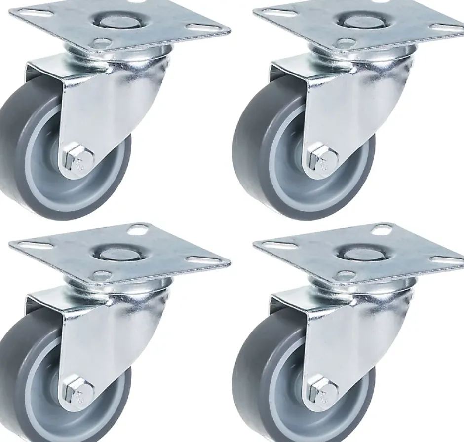 Jeu de 4 roulettes en caoutchouc gris de 50 mm avec plaque supérieure.Ces 4 roulettes pivotantes ont des roues en caoutchouc thermoplastique gris avec un centre en plastique.Les dimensions de l’article sont les suivantes :Diamètre de la roue : 50mmLargeur de la bande de roulement : 20 mmRoulement de roue : Palier lisseTaille de la plaque supérieure : 60x60mmCentre des trous de montage : 43x43mmTaille des trous de montage : 6 mmHauteur totale : 69,5 mmCapacité de charge : 40 kg par roulette (160 kg par jeu)Dureté de la bande de roulement 85° Shore A.Résistance au roulement raisonnable, faible bruit de fonctionnement et très bonne préservation des sols. Ne marque pas.Bonne résistance chimique à de nombreuses substances.