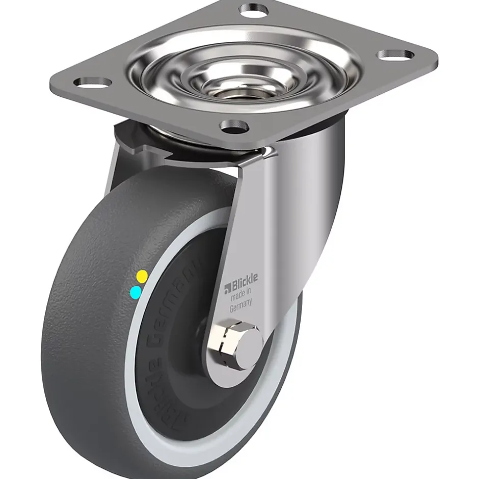Roulette pivotante en acier inoxydable avec support de plaque supérieure en acier embouti avec roulement à billes à double rangée dans la tête pivotante (matériau n° 1.4301/AISI 304), avec anneau de protection contre la poussière.Roue en polyuréthane thermoplastique (TPU) conducteur d’électricité, collée chimiquement sur un centre en nylon. Dureté de la bande de roulement : 94° shore A. Résistance aux fuites <10â’Ω.Roulement à billes supplémentaire étanche.Axe de roue boulonné.Faible résistance au roulement et bruit de fonctionnement. Bonne préservation des sols et non marquage.Très bonne résistance chimique à de nombreuses substances.Peut être équipé d’une serrure directionnelle à sens unique séparée, référence 573709.