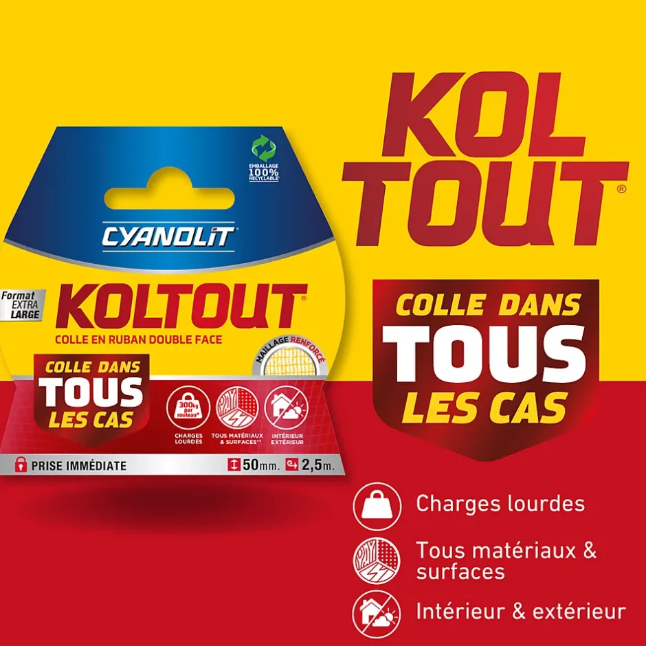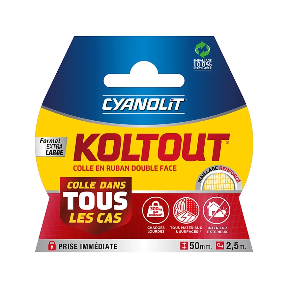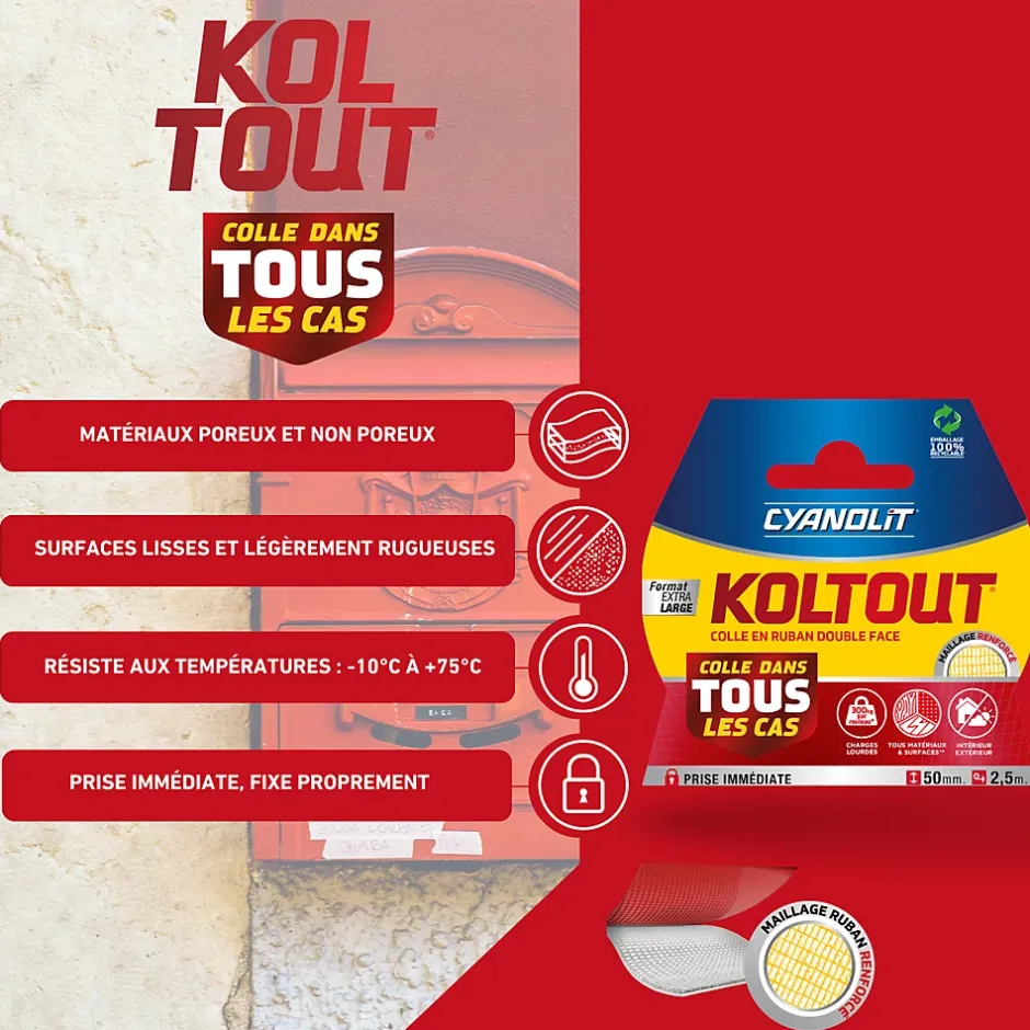 KOLTOUT RUBAN – Colle double-face ultra-résistante. Plus puissant qu’un simple adhésif, il fixe durablement tous types de matériaux (lisses, rugueux, poreux, rigides). Résistance extrême jusqu’à 720 kg (XXL), utilisable en intérieur et extérieur. Ultra-flexible, transparent, et supportant de -10°C à +75°C. Application facile et propre : nettoyer la surface, appliquer le ruban, presser fermement et retirer le film protecteur. Idéal pour miroirs, moulures, panneaux, accessoires de salle de bain et cuisine. Disponible en plusieurs formats : Standard, XXL, Extra-Fin, Maxi et Strips. Température idéale d’application : 15°C à 30°C.