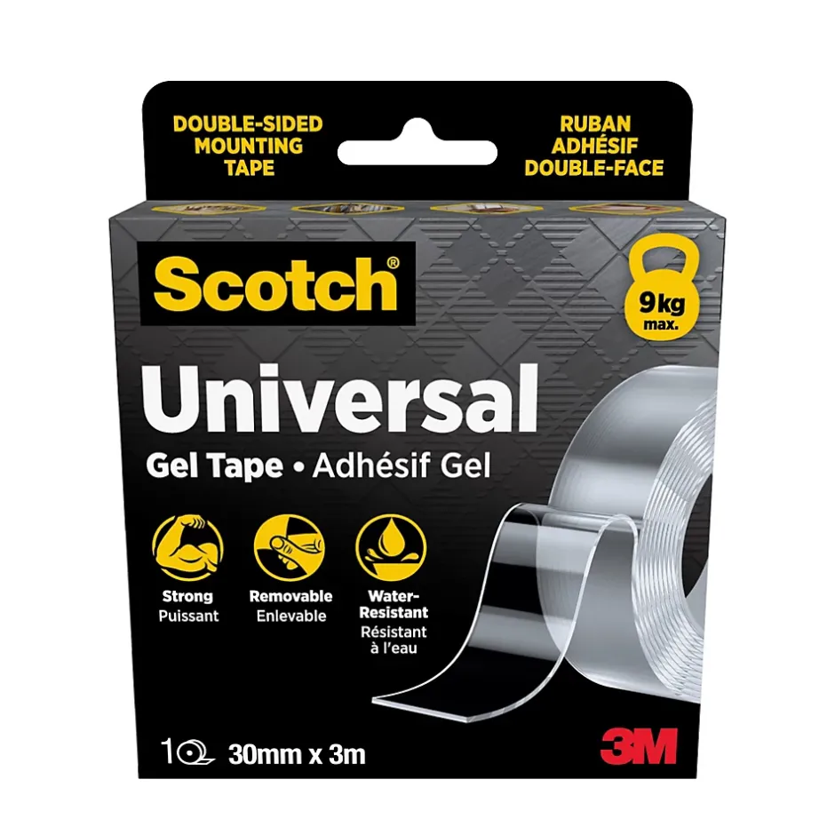 Adhésif double face universel en gel Scotch® 3m x 30mm transparent. Ce ruban adhésif amovible permet d’éviter de percer. Supporte en toute sécurité jusqu’à 9 kg, ce qui le rend adapté à la plupart des applications d’assemblage domestiques. La conception résistante à l’eau assure un assemblage solide même dans des environnements humides ou mouillés. Idéal pour de nombreuses surfaces dures, notamment le métal, le verre trempé, le carrelage, la pierre lisse, la brique et l’acrylique. Utilisez ce ruban de montage transparent pour les projets artistiques, les cadres suspendus, les affiches et les décorations légères.