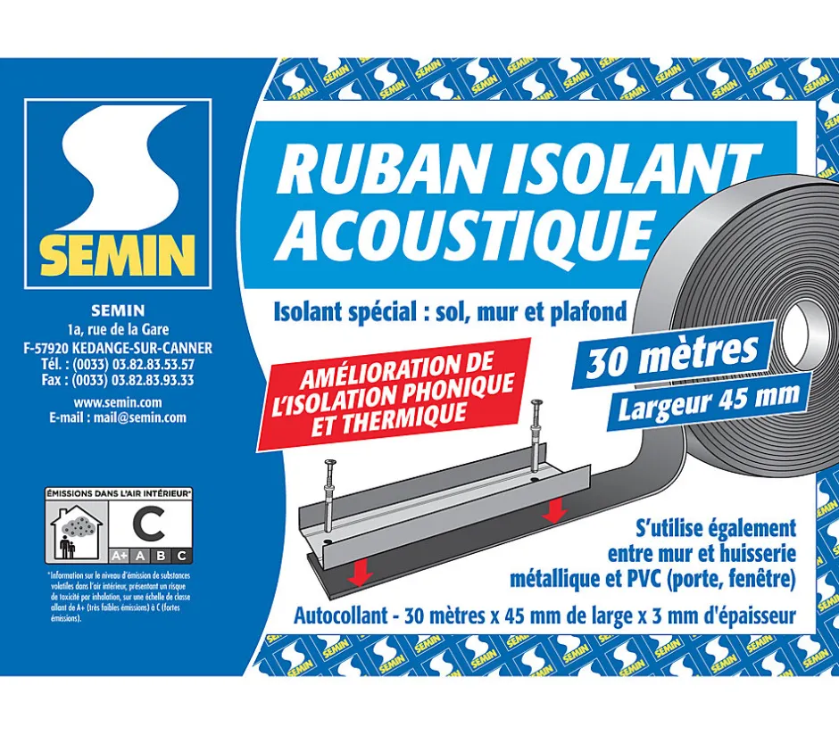 RUBAN ISOLANT ACOUSTIQUELe ruban isolant acoustique est un ruban adhésif en mousse de polyéthylène (PE) conçu pour garantir une fixation fiable et une étanchéité parfaite à l’air et au vent. Il est idéal pour :• Assurer l’étanchéité des jonctions entre les éléments métalliques (rails hauts et bas, montants latéraux)• Insonoriser les joints afin d’améliorer l’isolation phonique• Compenser les irrégularités et rugosités des surfaces• Prévenir les courants d’air de manière durableAVANTAGES- Pose rapide et facile grâce à l’auto-adhésif intégré- Excellente résistance aux températures et aux variations climatiques (-30°C à +80°C)- Isolation thermique et phonique optimisée pour un meilleur confortCARACTÉRISTIQUES TECHNIQUESRéaction au feu : B1 (auto-extinguible, difficilement inflammable) Longueur : 30 mLargeur : 45 mmMasse volumique : 29 kg/m²Résistance à la traction : Chaîne : 0,42 N/mm - Trame : 0,34 N/mmTempérature d’application : > 5°CRésistance thermique : -30°C à +80°C
