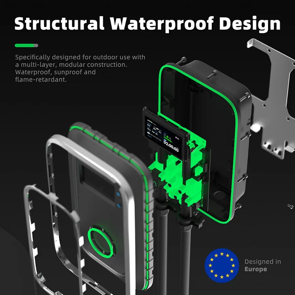 JATRHG S1 – Borne de recharge pour véhicules électriques 7 kW 32 A monophasé – Borne Type 2 IEC 62196-2 – Chargeur rapide Wallbox EV IP66Spécification du câble secteur : 3 × 6 mm², 1 m TPU (N / L / PE)Spécification du câble de recharge type 2 : 3 × 6 mm² + 0,75 mm², 8 m TPU (N / L / PE / CP)Température de fonctionnement : –30 °C à +50 °CClasse de résistance au feu : UL 94 V-0Certifications produit : CE, RoHSDimensions de l’emballage : 46 × 40 × 18 cmFonctions des boutons :Avec le bouton Marche/Arrêt, vous pouvez sélectionner différentes intensités de courant : 32 A, 16 A, 13 A, 10 A, 8 A, adaptées à différentes puissances de charge.L’intensité sélectionnée est automatiquement mémorisée, vous n’avez donc pas besoin de la reconfigurer au prochain démarrage.Le bouton de retard permet de programmer un démarrage différé entre 0 h et 12 h – idéal pour charger en dehors des périodes de pointe.Multilingue :En maintenant le bouton Marche/Arrêt enfoncé, le système bascule automatiquement entre les langues disponibles : anglais, français, allemand, italien et espagnol.La langue sélectionnée est automatiquement mémorisée.Les indications sur l’écran apparaissent également dans la langue choisie, offrant un confort supplémentaire pour les utilisateurs européens.Instructions d’installation :Dispositifs de protection nécessaires pour l’installation d’une borne 7 kW :– Disjoncteur 40A courbe C : pour la protection contre les surcharges et les courts-circuits.– Interrupteur différentiel 40A – 30mA de type B: pour la protection contre les fuites de courant, garantissant la sécurité des utilisateurs.Remarque : ces composants ne sont pas fournis et doivent être achetés séparément.Ces appareils doivent être installés conformément aux normes électriques en vigueur afin d’assurer une utilisation sûre et fiable.