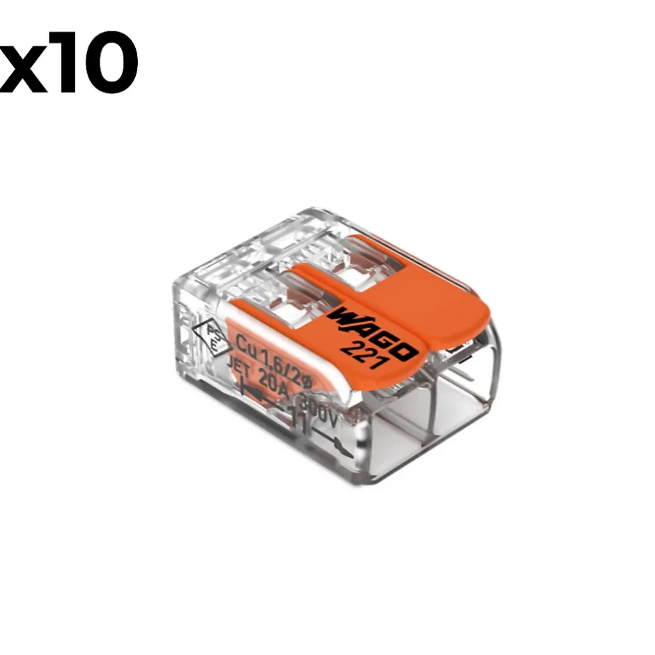 Caractéristiques de la borne à levier pour fil rigide, semi-rigide et souple 0,14-4 mm² – WagoModèle : borne à levierSérie 221Pour fils rigides, semi-rigides et souplesSection des fils pris en charge : 0,14 mm² à 4 mm²Tension de référence : 450 VCourant nominal : 32 ALongueur de dénudage recommandée : 11 mmAvec 2/3/5 entréesSachet de 5 ou 10La borne à levier pour fils rigides, semi-rigides et souples est une solution idéale pour réaliser des connexions électriques rapides et sécurisées.Elle est compatible avec des fils de 0,14 mm² à 4 mm², offrant une grande flexibilité pour divers types de câblage. Cette borne supporte une tension de référence de 450 V et un courant nominal de 32 A, garantissant une haute performance et une sécurité accrue dans les installations électriques.La longueur de dénudage recommandée de 11 mm permet un contact stable et efficace. Disponible avec 2, 3 ou 5 entrées, cette borne s’adapte à différentes configurations de câblage, et est proposée en sachet de 5 ou 10 unités, ce qui la rend idéale pour les projets de petite ou grande envergure. Ce produit est particulièrement adapté aux professionnels et aux bricoleurs, offrant à la fois fiabilité, facilité d’installation et économie.