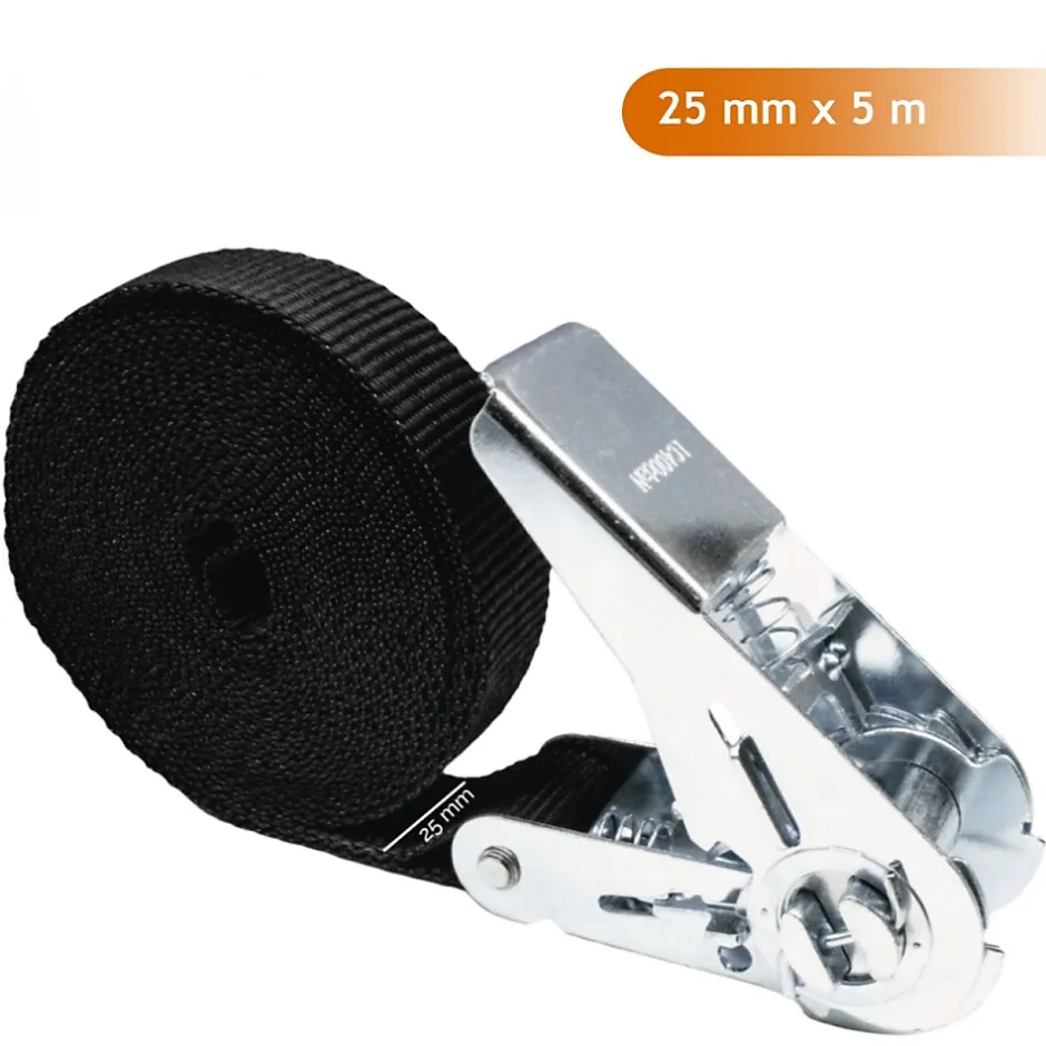 La sangle à cliquet 25 mm par 5 m Linxor est parfaite pour maintenir votre chargement et satisfaire tous vos besoins en matière d’arrimage.La sangle est réalisée en polyester et a une excellente robustesse à l’abrasion et aux U.V, associée à à un tendeur à cliquer en acier chromé, la sangle à cliquet a ainsi une haute résistance et une durabilité maximale dans le temps.La sangle à cliquet peut supporter une tension maximale d’utilisation (TMU) de 350 kg en boucle et 175 kg en bout droit.Dimensions : 5 m en longueur et 25 mm de largeur. Coloris noir.Conforme à la norme : EN 121 95-2.Autres dimensions et packs disponibles.