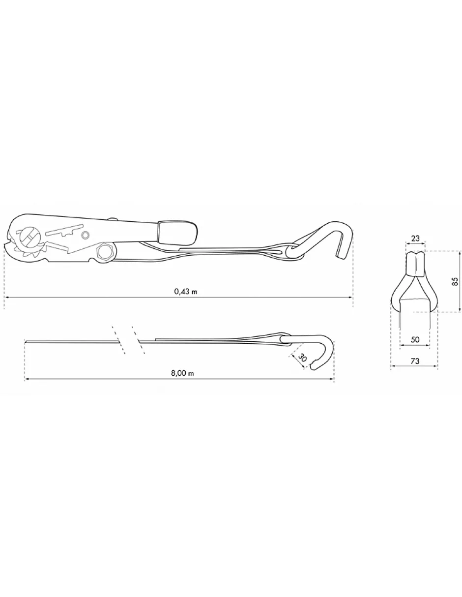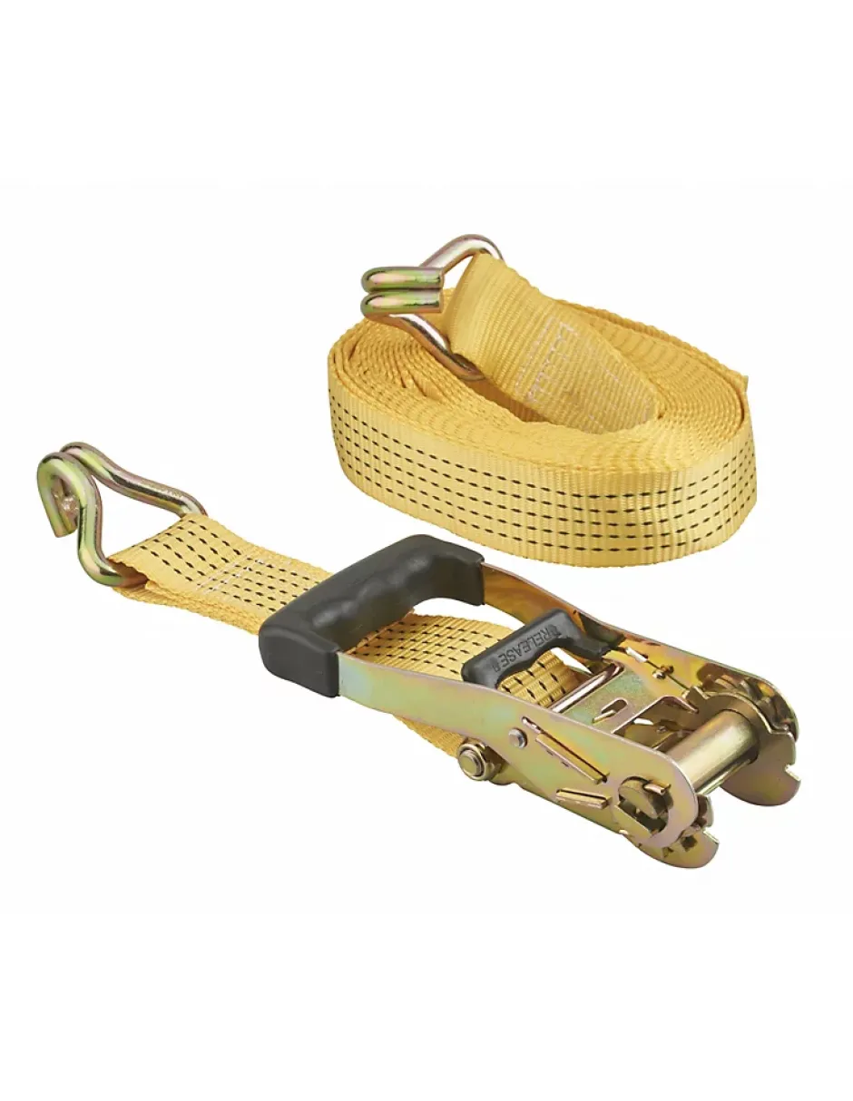 Sangle polyester à tendeur à cliquet, poignée ergonomique PVC, avec crochets d’ancrages en JJ (crochet à griffe fermé).