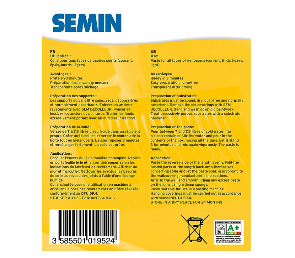 COLLE IDÉALE POUR TOUS LES PAPIERS PEINTS STANDARDS – POUR 7 ROULEAUXLa colle à papier peint s’adapte à tous les types de papiers peints standards (courants, épais…) et sur de nombreux supports : plaques de plâtre, carreaux de plâtre, béton ou enduit ciment et plâtre.Ce pack contient :Colle papiers peints, 3 boites de 250 gLES AVANTAGES DE LA COLLE A PAPIER PEINTLa colle à papier peint en poudre présente de nombreux avantages pour vos travaux :• Un produit idéal pour tous les types de papiers peints ;• Une colle à papier peint prête en 3 minutes ;• Un aspect transparent après séchage ;• Une pâte sans grumeaux ;• Un haut rendement ;• Une glisse parfaite.Facilité et rapidité d’homogénéisation ainsi que sa glisse exceptionnelle lui confèrent une mise en œuvre aisée.CARACTÉRISTIQUES TECHNIQUESPoids : Boite de 250 gRendement : 7 rouleauxPréparation : 7 à 7,5 litres d’eau froideUsage : Intérieur – murs et plafonds