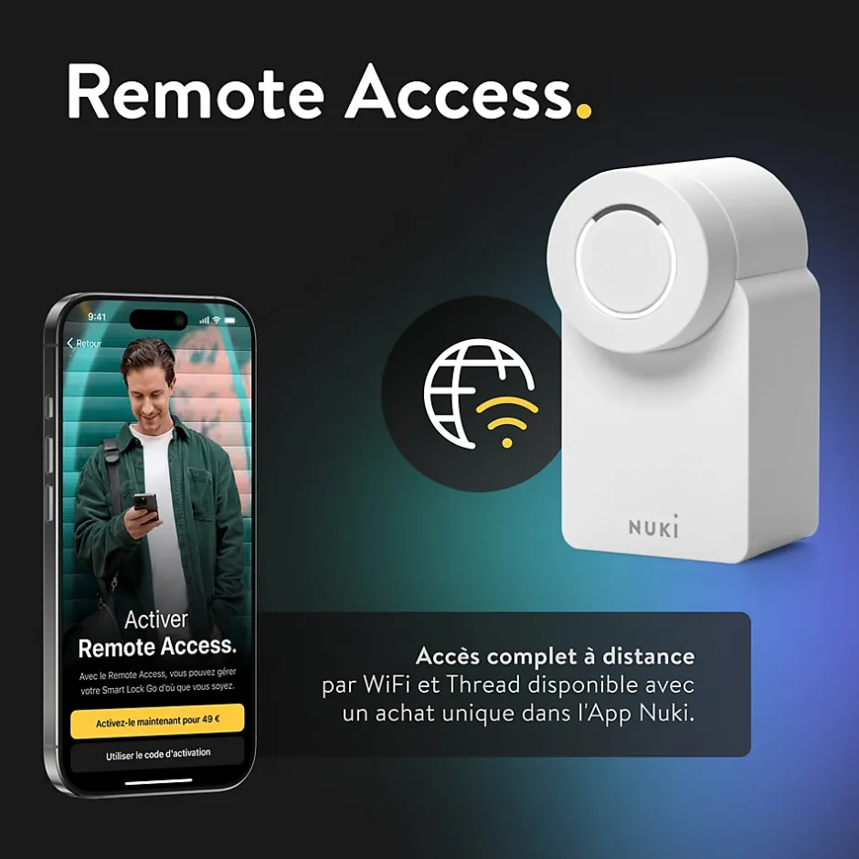 - Nuki Smart Lock Go est votre entrée dans le monde de la maison connectée : transformez votre smartphone en clé. Parfait pour votre domicile, votre immeuble de bureaux ou vos biens en location ; utilisez votre téléphone ou votre montre connectée pour verrouiller et déverrouiller votre porte. Vous pouvez même automatiser entièrement l’ouverture et la fermeture avec des horaires et des fonctionnalités Auto Lock et Auto Unlock.