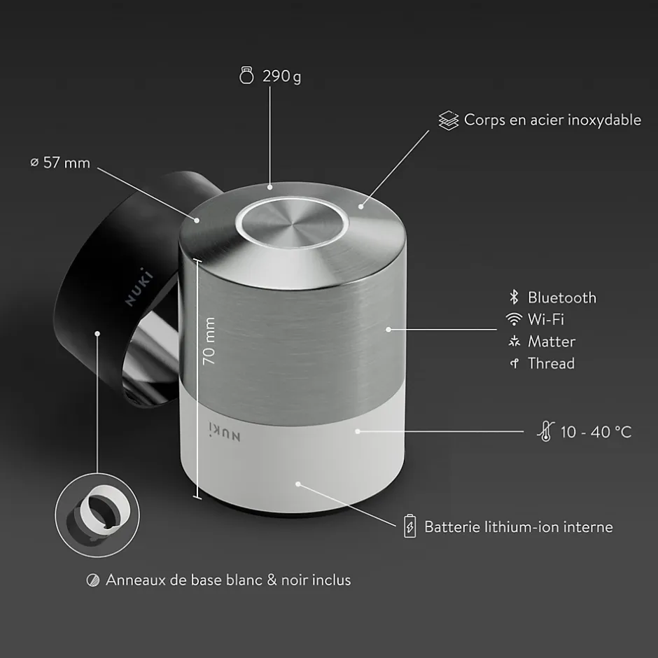 La Nuki Smart Lock Pro est la serrure connectée de post-équipement la plus sophistiquée de la gamme Nuki. Pilotez votre porte à distance depuis votre smartphone ou votre smartwatch, ou profitez d’une expérience entièrement automatisée grâce à la fonction Auto Unlock, qui déverrouille la porte dès votre arrivée. Équipée d’un moteur sans balai ultra-performant, la Nuki Pro offre des vitesses de verrouillage et de déverrouillage exceptionnelles, tout en restant silencieuse selon le mode choisi. Son corps en acier inoxydable haut de gamme, associé à deux anneaux interchangeables noir et blanc, permet d’adapter son design à votre intérieur. Conçue pour une installation rapide sans perçage ni modification, elle se fixe en quelques minutes sur la face intérieure de la porte, directement sur le cylindre existant. Aucun hub ni passerelle externe n’est nécessaire : la Smart Lock Pro intègre le Wi-Fi et Matter via Thread, pour un pilotage à distance immédiat. Rechargeable, elle offre une autonomie de 4 à 9 mois selon l’usage, avec une charge complète en seulement 2 heures, sur la porte ou hors de la porte. Grâce à l’application Nuki, gérez jusqu’à 200 accès utilisateurs, consultez le journal d’activité et activez des automatisations avancées comme Auto Unlock, Lock’n Go ou le mode nuit.
