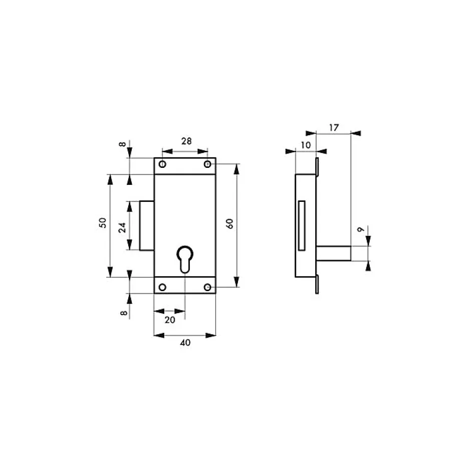 Coffre et pêne acier. Pose à droite ou à gauche. 1 clé laitonnée vieillie.