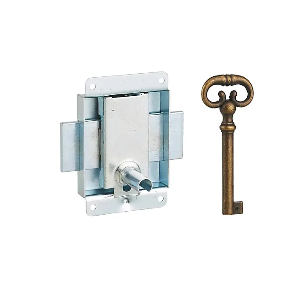 Coffre et pêne acier. Pose à droite ou à gauche. 1 clé laitonnée vieillie.