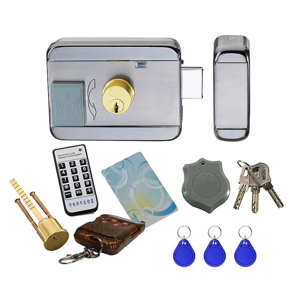 La serrure électrique télécommandée de portail ou portillon permet d’avoir une serrure complète de gestion d’accès tout intégré en un.Comprend 1 serrure électrique télécommandé motorisée avec ces accessoires, 1 télécommande de portail , 3 badges ainsi qu’une télécommande et carte de programmation rapide.Intégrée à la serrure récepteur radio qui permet de la piloter à distance jusqu’à 50M grâce à la télécommande fournie.Un lecteur de badge intérieur et extérieur (lecteur autour du barillet) est intégré à la serrure autant de l’intérieur que de l’extérieur permettant d’ouvrir la serrure en présentant devant le badge sans contact.Il vous suffit pour ouvrir votre porte de présenter le badge devant la serrure électrique télécommandée et le verrou s’ouvre tout seul.Le serrure électrique télécommandée se refermera automatiquement dès que la serrure aura détecté la position de porte fermée du portillon grâce à son capteur magnétique de position.Le fonctionnement est identique pour l’ouverture par télécommande ou bouton poussoir, et la serrure électrique télécommandée refermera également automatiquement le portillon si ouvert avec la clé.Ouverture classique à l’aide des clés (3 clés fournies)Vous pouvez également relier à la serrure électrique télécommandée un bouton poussoir extérieur.Cette serrure électrique télécommandée de portail, accepte jusqu’à 6 télécommandes et 2000 badges magnétique.Les différents réglages et paramétrages de la serrure électrique se font à l’aide d’une télécommande infrarouge fournie avec la serrure.Description technique de la serrure électrique télécommandée:Tension de travail : 12VDCCourant consommé en fonctionnement : inf 300mACourant consommé au repos : inf 50mATempérature de fonctionnement -20°C à +60°CHumidité relative de travail : entre 10% et 90%Diamètre barillet : 20mmDimension serrure : 128 x 98 x 46 mmS’installe sur des porte d’épaisseur de 40 à 90mm