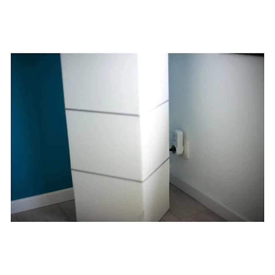 - Boîtier compact rectangulaire en PVC blanc, matériau plastique résistant.