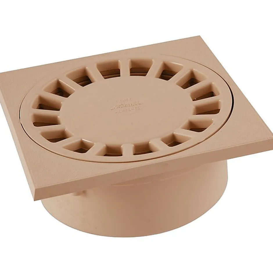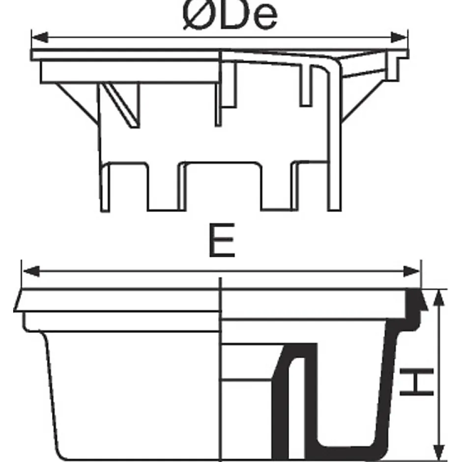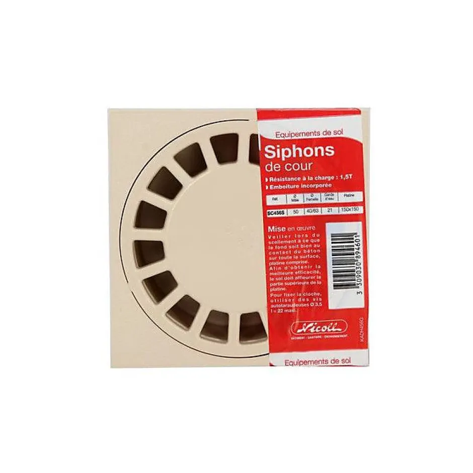 Siphon de cour Modèle à emboiture incorporée Sortie verticale Grande garde d’eau et grand débit Possibilité de fixer la cloche : prendre 2 vis tête plate auto-taraudeuse Ø 3,5 (L = 22 maxi)