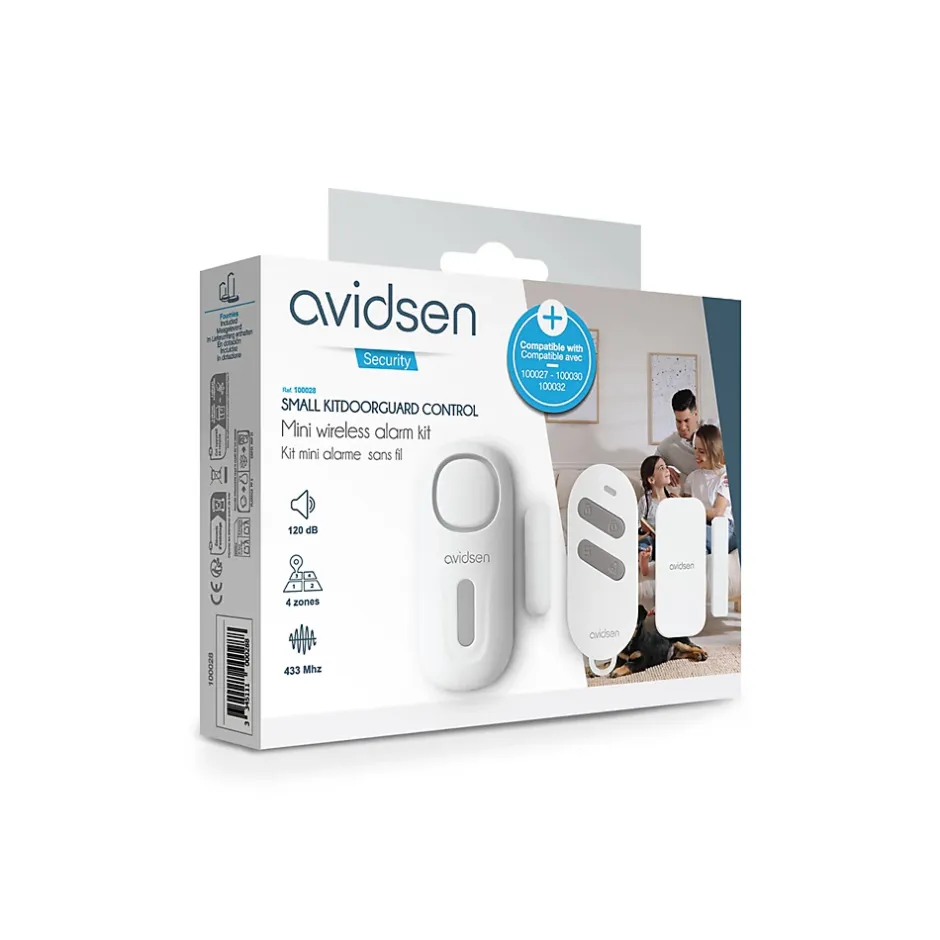 Une sécurité à vos entréesSécurisez vos points d’entrée avec le kit de détecteurs d’ouverture porte et fenêtre Small Kitdoorguard Control d’Avidsen. Avec ces différents modes proposés, ces détecteurs s’adapteront à vos différents besoin. Vous pouvez armer et désarmer les mini alarmes avec la télécommandes incluse dans le kit. Premier mode : le mode NormalConfigurez vos alertes avec une sonnerie de carillon ou avec la sirène lors de l’ouverture de la porte ou de la fenêtre :- Lorsque le détecteur est armé et mis sur le mode Carillon, quand la porte s’ouvre, la sonnerie carillon se déclenche.- Quand le produit est activé et sur le mode Alarme, l’ouverture de la porte déclenche l’alarme de 120dB.Deuxième mode : le mode ZoneLe produit est divisé en 4 zones pour un large choix d’alerte :- Les zones 1 et 2 sont des zones Normales : si la mini alarme est armée, celle-ci déclenche la sirène lors de l’ouverture. – La zone 3 est une zone Carillon : armée ou pas, lors de l’ouverture, la mini alarme déclenche une sonnerie de bienvenue. – La zone 4 est une zone d’Urgence qui déclenche la sirène lors d’une ouverture, avec l’armement ou non de la mini alarme. Une compatibilité considérable avec la gamme mini alarmes d’AvidsenComplétez la sécurité de votre habitation avec les accessoires et mini-alarme supplémentaires de la gamme Avidsen. Ce kit est compatible avec jusqu’à 40 accessoires, dont 10 par zone et 10 télécommandes, pour une protection entièrement modulable et adaptée à vos besoins.Le contenu du kitCe kit contient