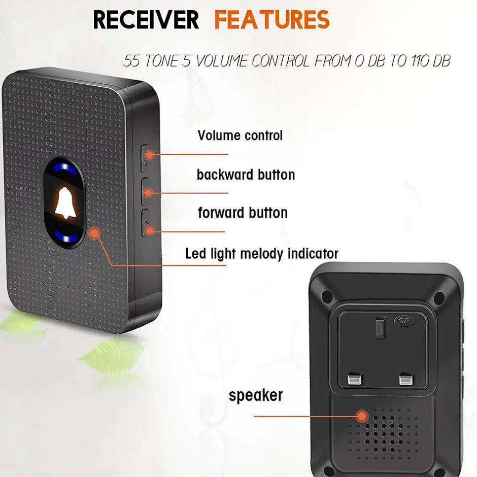 Longue portée, signal puissant : La sonnette extérieure étanche sans fil a une portée de signal allant jusqu’à 300 mètres, ce qui vous permet d’entendre clairement les visiteurs où que vous soyez dans votre maison, vous assurant ainsi de ne manquer aucun visiteur ou livraison importante.Commodité du sans fil : Découvrez la commodité de la technologie sans fil avec notre sonnette sans fil, vous libérant ainsi d’une installation de câble encombrante. La conception facile à utiliser vous permet de profiter immédiatement d’une connexion sans fil stable.55 mélodies et 5 volumes : 55 mélodies différentes et 5 volumes (0-110 dB) à choisir selon vos préférences et votre style.Waterproof & Durable : Le bouton émetteur est fabriqué à partir de matériaux de haute qualité et répond à la norme d’étanchéité IP55, notre sonnette sans fil peut fonctionner de manière fiable dans toutes les conditions météorologiques. Qu’il pleuve ou qu’il fasse beau, la performance de la sonnette sans fil ne sera pas affectée, vous donnant la tranquillité d’esprit à tout moment.Sans batterie