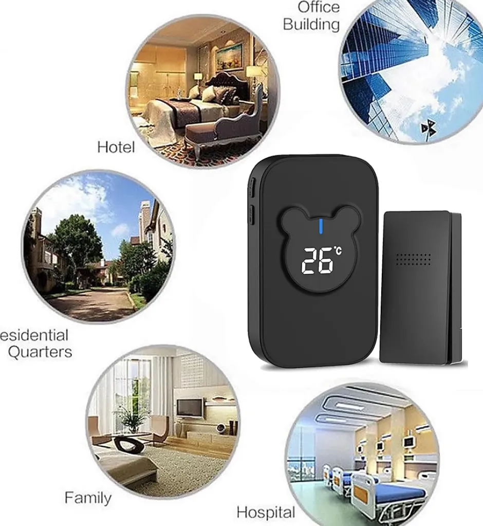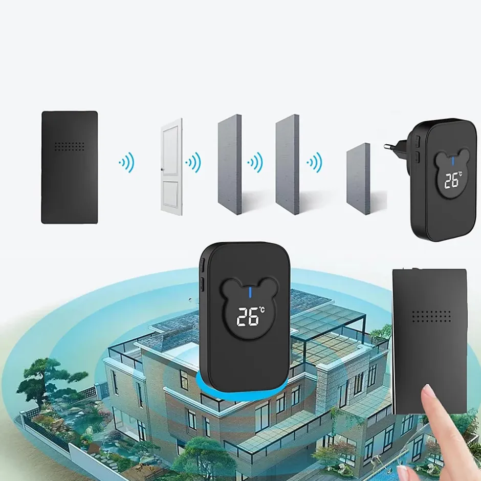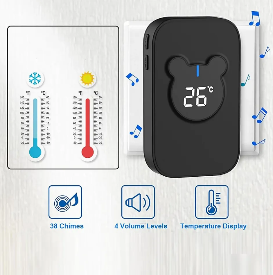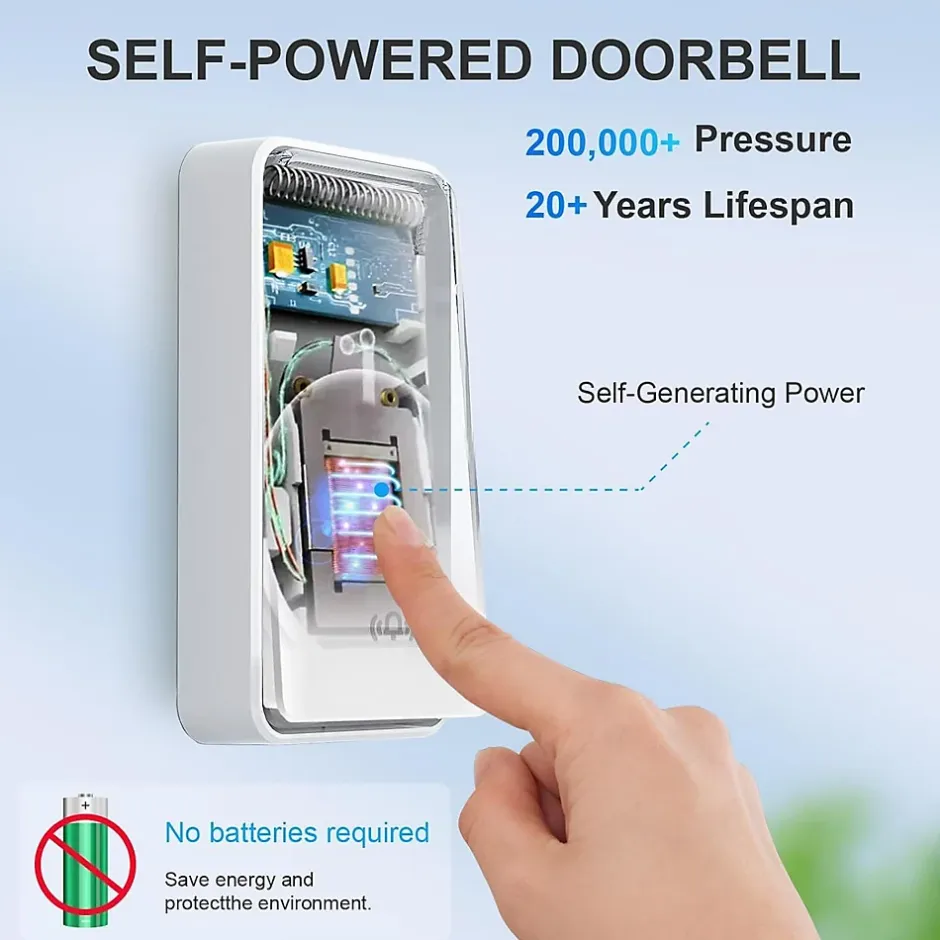 émetteur auto-alimenté de sonnette, il y a un micro-générateur dans l’émetteur qui génère du courant électrique et envoie le signal au récepteur lorsqu’il est pressé. Aucune pile n’est requise pour ce carillon de porte.Longue Portee: La sonnette sans fil est idéale pour une portée jusqu’à 150m sans perte de signal et possède une forte capacité anti-interférence,ce qui convient parfaitement à un usage domestiqueRéglage de la Sonnerie : choisissez votre son préféré parmi les 38 mélodies différentes. 4 niveaux réglables entre 0 dB et 80 dB. En plus, un signal LED optique apparaît quand quelqu’un presse la sonnette.Facile a Installer: Fixez la sonnette au mur avec des vis ou à l’aide de ruban adhésif double face et le récepteur directement dans une prise,Pas besoin de réseau ou de câblageSonnette Étanche IP65 : fort imperméable à l’eau, peut installer la sonnette (émetteur) à l’extérieur de la maison; sa température de travail est de – 20 °C à +60 °C ; résiste aux temps maux