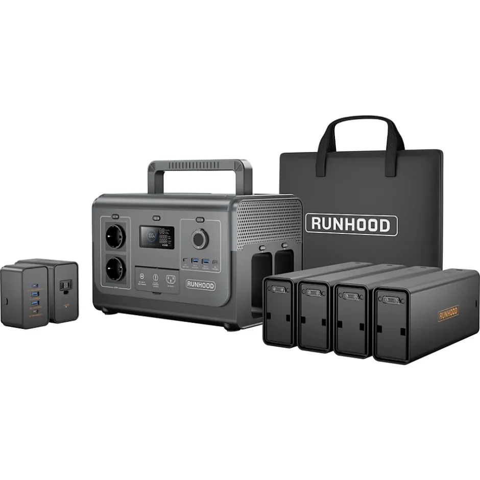 RUNHOOD Host Engine HE1200 – Puissance 1200 W | Station Modulaire Ultra-PolyvalenteLe RUNHOOD HE1200 est une station d’énergie révolutionnaire conçue pour une alimentation mobile fiable et évolutive. Grâce à son design modulaire, elle peut accueillir jusqu’à 4 batteries EB324 échangeables à chaud (Swap & Go), et offrir une puissance de 1200 W en sinus pur, avec un pic à 2400 W. Parfait pour alimenter vos appareils à la maison, en camping, au bureau mobile ou en déplacement.⚡ Performances et autonomie Sortie AC 1200 W (sinus pur) – Puissance stable pour tous les appareils sensibles Capacité de 648 Wh (4× EB324 incluses) – Alimentation prolongée et fiable Échange à chaud : changez les batteries sans couper l’alimentation Connectivité & recharge intelligente 4 modes de recharge : secteur 180 W, solaire (via SERI 100), voiture 12 V, adaptateur SC200 Pass-through : rechargez et utilisez simultanément Modules AE80 & UE256 inclus : sorties AC 80 W et 4× USB (PD 100 W + QC) Chargeur à induction pour smartphone sur le dessus Utilisation et design Station modulaire : connectez de 1 à 4 batteries selon vos besoins Portable & léger : format idéal pour camping, festivals, vans ou secours domestique Durabilité : batteries Li-ion avec >1 000 cycles à 80 % DOD Inclus dans ce pack 1 × Station HE1200 4 × Batteries EB324 (324 Wh chacune) 1 × Onduleur AE80 (sortie AC 80 W) 1 × Module USB UE256 (4 ports – USB-C + USB-A) 1 × Panneau solaire SERI 100 (100 W pliable, MPPT, IPX6)La HE1200 est la station la plus modulaire du marché, capable d’évoluer en fonction de vos besoins, que vous soyez chez vous, sur la route ou en pleine nature.