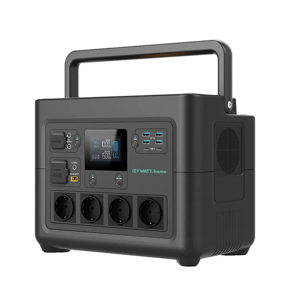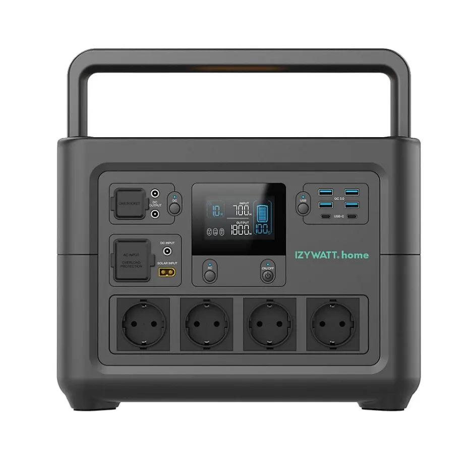 IZYWATT.homePuissance portable et autonomie fiableUne solution compacte et performante pour alimenter vos appareils domestiques et outils électriques. Prête à l’emploi, toujours mobile et facile à transporter !Capacité et durabilitéBatterie de 1 536 Wh avec technologie LFP pour plus de 3 000 cycles. Fournit une puissance continue de 1 800 W, avec éclairage intégré et mode EPS pour un fonctionnement fiable dans toutes les situations.Recharge flexible : Choisissez le mode de charge adapté à votre situation : secteur, solaire jusqu’à 600 W ou allume-cigare pour rester mobile. La s…