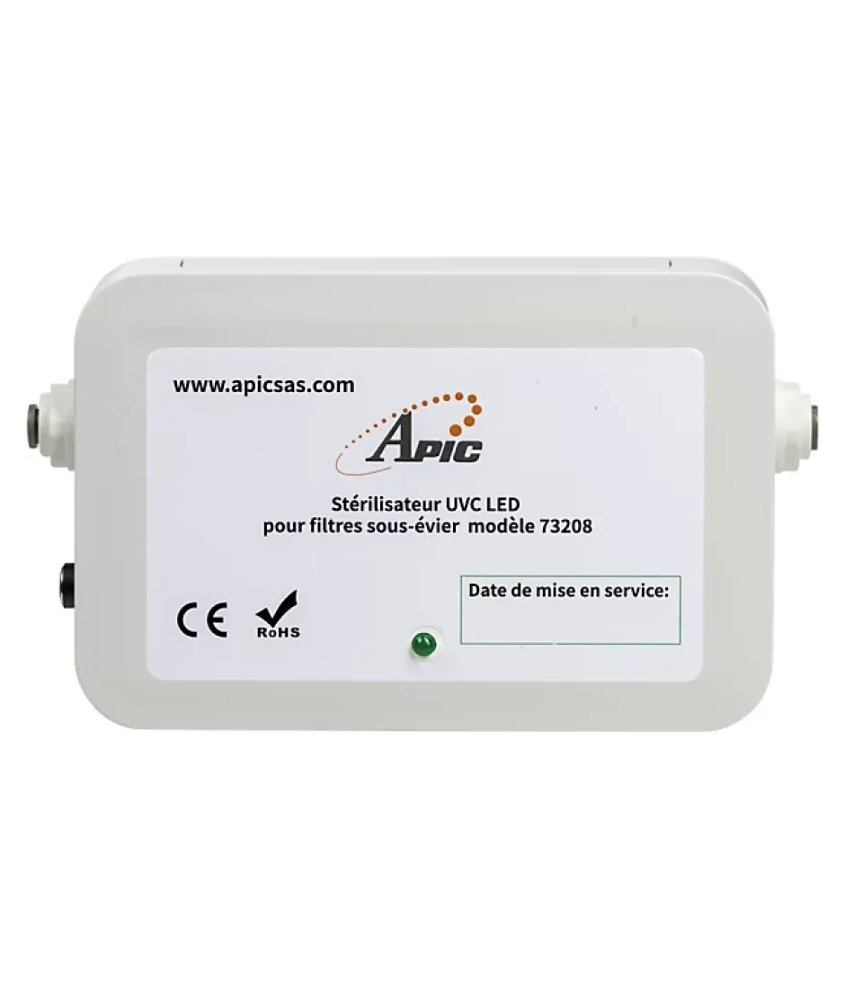 Stérilisateur d’eau potable UVC LED : Barrière anti-bactérienne Ce stérilisateur d’eau potable vous garantit une eau saine et stérilisée. Il traite les bactéries à 99.99%. Il est compatible avec une multitude de système de filtration de l’eau. Pour une eau plus saine, prête à boire, sans bactéries ni virus. Votre meilleur allié de votre système de filtration de l’eau. Purificateur d’eau pour une eau meilleure et purifiée grâce aux rayonnements UVC émis par LED . Cette technologie permet au stérilisateur d’eau potable de créer une barrière anti bactérienne. Emet des UVC avec une longueur d’onde comprise entre 250 et 280 nm. Il convient à tout type de logement grâce à son faible encombrement. Ce stérilisateur est à utiliser comme postfiltre sous évier pour l’eau de boisson et à raccorder à un mitigeur 3 voies ou robinet d’appoint . Cf schéma d’utilisation. Débit 3 L /min Alimentation standard européenne fourni 22V CE Matériaux sûrs et de qualité : Raccordement Entrée / Sortie : 1/4″ Longue durée de vie de l’appareil . Le stérilisateur est à remplacer tous les 6 ans / 3000 heures d’utilisation. La LED s’allume et s’éteint automatiquement grâce au capteur de débit d’eau Design compact Caractéristiques : Cycle de vie : 3000 heures ou 6 ans 1h/j Température : 5-45°C (craint le gel) Raccordement : connecteur 1/4″ Poids : 241 g Dimensions : P. 150 * L. 100 * H. 30 mm* Attention : ·Stockage du produit: il est recommandé de stocker ce produit à une température comprise entre 5)C et 45°C et de le conserver hermétiquement. ·Utilisation et installation du produit: ce produit est sensible aux champs magnétiques. Veillez à la protection contre l’électricité statique. ·Avant d’utiliser ce produit, vérifiez que l’établi et l’équipement de production sont mis à la terre. Nous vous invitons à suivre les précautions d’emploi spécifiées dans le manuel d’utilisation.