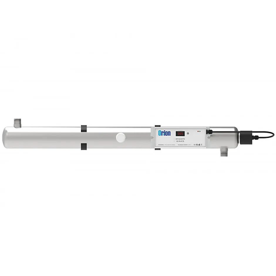 Stérilisateur UV 4m3/hLa stérilisation par ultra-violet est un procédé de traitement de l’eau 100 % physique qui imite l’effet assainissant de la lumière solaire par les lampes UV. Elles émettent des rayons lumineux avec un maximum d’intensité à 253,7 nanomètres qui permettent d’enlever complètement les bactéries présents dans l’eau pour la rendre potable.Ces stérilisateurs UV peuvent être utilisés pour traiter l’eau de forage, l’eau d’adduction ou l’eau d’un puits, contaminés par des bactéries. Pour garantir la potabilisation de l’eau, celle-ci doit être chimiquement potable avant le traitement de l’eau.Le stérilisateur UV est un réacteur chimique cylindrique fermé en inox 316 L et équipé d’une lampe à vapeur de mercure basse pression émettant dans la longueur d’onde germicide de 253,7 nanomètres et de puissance électrique de 30 Watts.L’ensemble est commandé par un coffret électrique assurant l’allumage de la lampe, son fonctionnement et le comptage des heures de fonctionnement.Le stérilisateur doit être installé horizontalement. Il est recommandé de le fixer au mur.FABRICANT : UVRERApplications :Traitement d’eau brute (forages, captages, puits…)Sécurisation d’eau de pluie (usage sanitaire uniquement)Sécurisation d’eau de réseauCaractéristiques :Chambre de traitement inox 316 LPression max 6 barsTempérature de l’eau 0 à 40 °CRegard pour cellule de contrôleRaccordement en axe opposéGaine quartz fond bombéLampe mono-culot 9 000 hCoffret électrique fixé sur la chambreAffichage digital avec décompte journalierAlarme visuelle et sonoreLeds vertes et rouges d’état de lampeBuzzer défaut lampeCordon d’alimentation 220 V+TDurée de vie des consommables :Lampe UVc : 9 000 heuresJoint : 9 000 heuresGaine : 5 ans Fréquences consommables