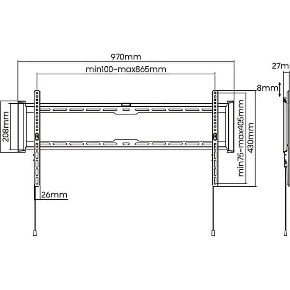Support mural fixe SLIM STELL SHO 7210 pour TV 43–90 pouces, acier noir, charge 75 kg, profil ultra-plat 2,7 cm, compatible VESA étendu.