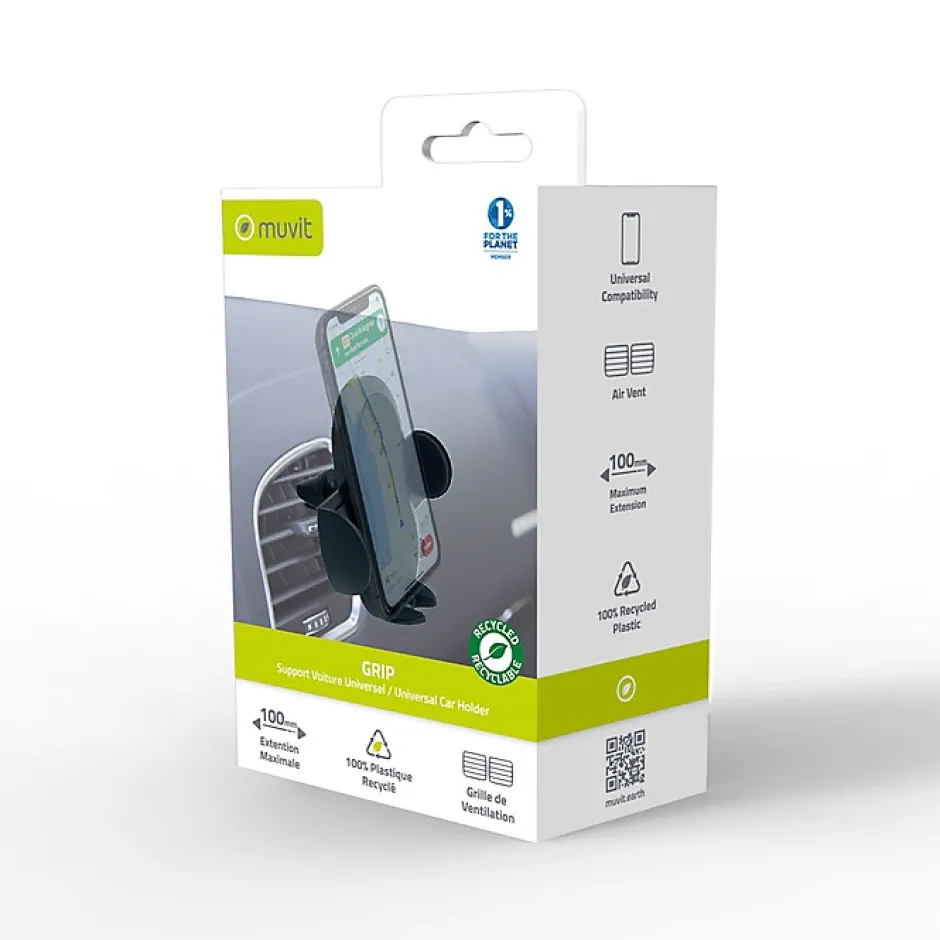 Support Voiture Universel GripCe support voiture Grip noir de marque Muvit est compatible avec tout Smartphone ayant une largeur entre 50 à 100mm. Il dispose d’une pince extensible jusqu’à 100mm, favorisant un maintien stable de votre mobile. Ce support peut être solidement fixé sur tout type de grilles d’aération. La rotation à 360 degrés permet d’obtenir l’angle de vue parfait.En résumé :Compatible avec tout Smartphone ayant une largeur entre 50 à 100mm.Dispose d’une pince extensible jusqu’à 100mm, favorisant un maintien stable de votre mobile.Peut être solidement fixé sur tout type de grilles d’aération.Permet d’avoir l’angle de vue parfait grâce à sa rotation 360°.