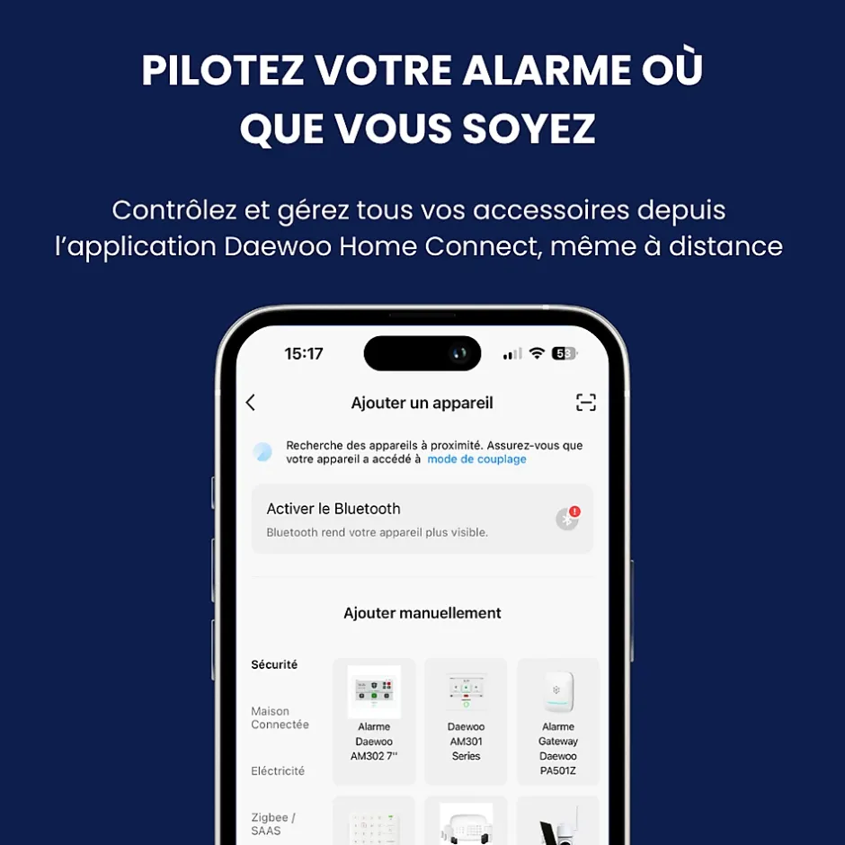 - Pilotage intégral depuis le smartphone : Armez, désarmez et gérez votre système de n’importe où dans le monde grâce à l’application gratuite et intuitive Daewoo Home Connect.