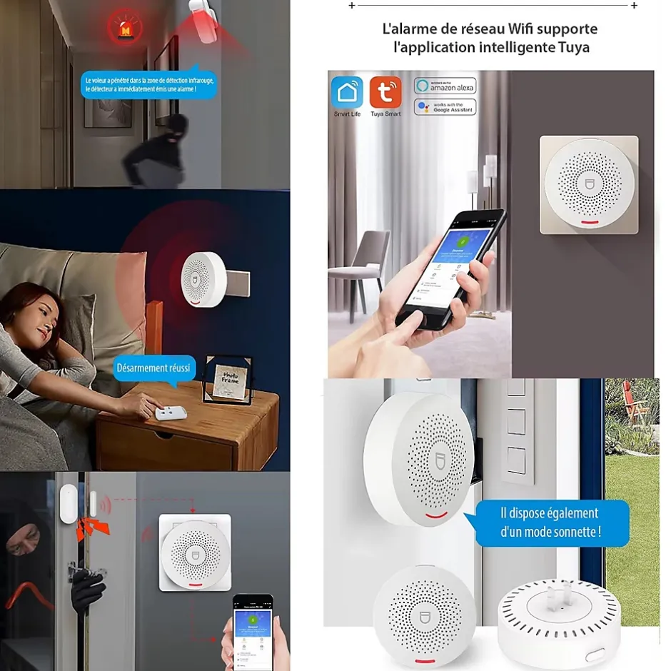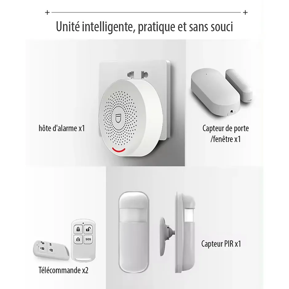 Découvrez le kit de système de sécurité sans fil Somlife, votre allié ultime pour sécuriser votre domicile avec efficacité. Ce kit complet comprend une station de base, deux télécommandes, un capteur de mouvement et un capteur d’ouverture de porte ou fenetre . Contrôlez facilement votre système d’alarme intelligente depuis n’importe où grâce à l’application Smart Life ou tuya sur votre smartphone.Caractéristiques:Notifications Instantanées :Recevez des alertes en temps réel sur votre smartphone lorsque quelqu’un entre par une porte ou une fenêtre sans autorisationLes capteurs d’entrée déclenchent une alarme sonore forte depuis la station de baseInstallation Simplifiée :Installation DIY rapide sans outils nécessairesConnexion sans fil pour une protection continue en cas de coupure de courantFiabilité et Flexibilité :Matériaux de haute qualité assurant un système stable et fiableConfiguration facile et connexion ultra-stable des capteurs à la station de basePersonnalisation Avancée :Nommez chaque capteur pour une gestion précise des zones surveilléesSurveillance en temps réel de l’état des capteurs via l’application mobileSpécifications TechniquesSirène intégrée pour une dissuasion efficaceContrôle via l’application pour une gestion à distanceFonction sonnette pour une utilisation quotidienne pratiqueTension d’entrée : AC100V ~ 240VCourant de travail : 20mAFréquence sans fil : 433MhzEncodage sans fil : eV1527Wi-Fi : IEEE802.11b/g/nTempérature de fonctionnement : -10°C à 55°CHumidité : Applications et UtilisationIdéal pour les maisons, appartements, bureaux, garages, magasins et condos, ce système offre une sécurité polyvalente et efficace pour toutes les situations….