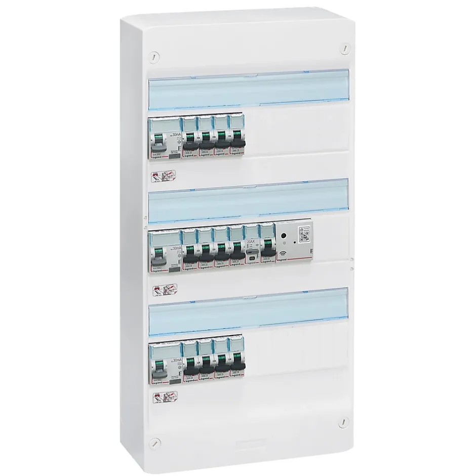 Tableau électrique à trois rangées, pré-équipé avec des dispositifs connectés adaptés aux appareils à forte consommation d’énergie, tels que les ballons d’eau chaude, les bornes de recharge pour véhicules électriques, etc.