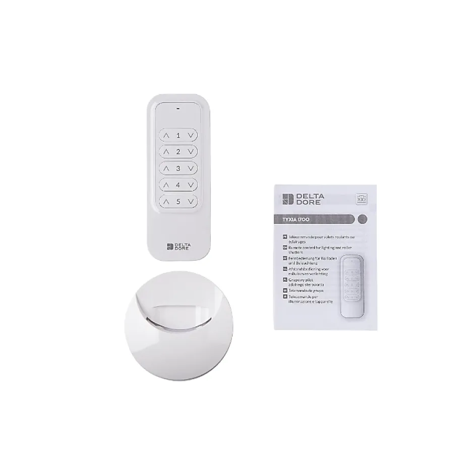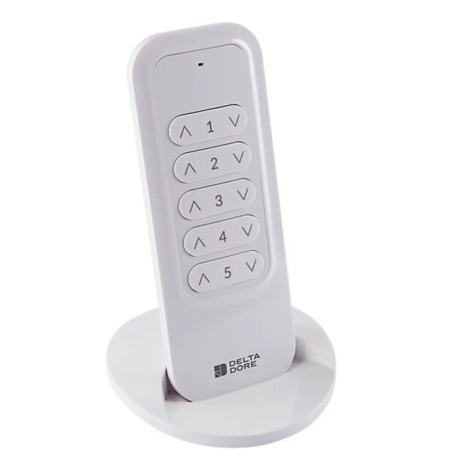Télécommande pour volets roulants et éclairages – TYXIA 1700 – Delta DoreCette télécommande Delta Dore vous permet de centraliser sur une même point de commande jusqu’à 5 équipements pilotables à distance. Il peut s’agir de volets roulants ou d’éclairages munis de récepteurs radios ou encore de moteurs radio équipant d’autres appareils.Elle est compatible toutes marques et permet de gagner du temps en gérant l’ensemble des équipements d’une pièce par exemple, facilement et rapidement.