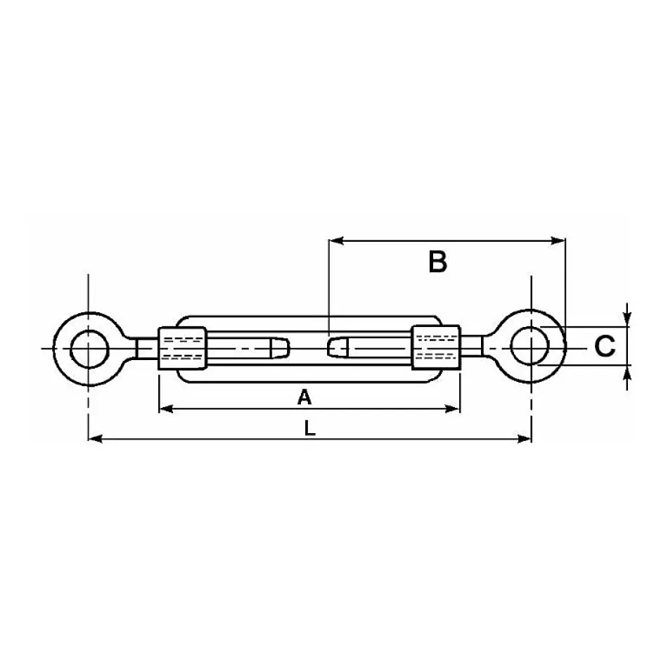 Tendeur à cage 2 anneaux – Filetage Ø 20 mmA mm 220B mm 190C mm 25Type de tendeur : à 2 anneauxLongueur mini mm : 340Longueur maxi mm : 470Ø Filetage mm : 20 (pouces 3/4′ pouces)Matériau: acier Fe430BCharge maxi : kg 2700