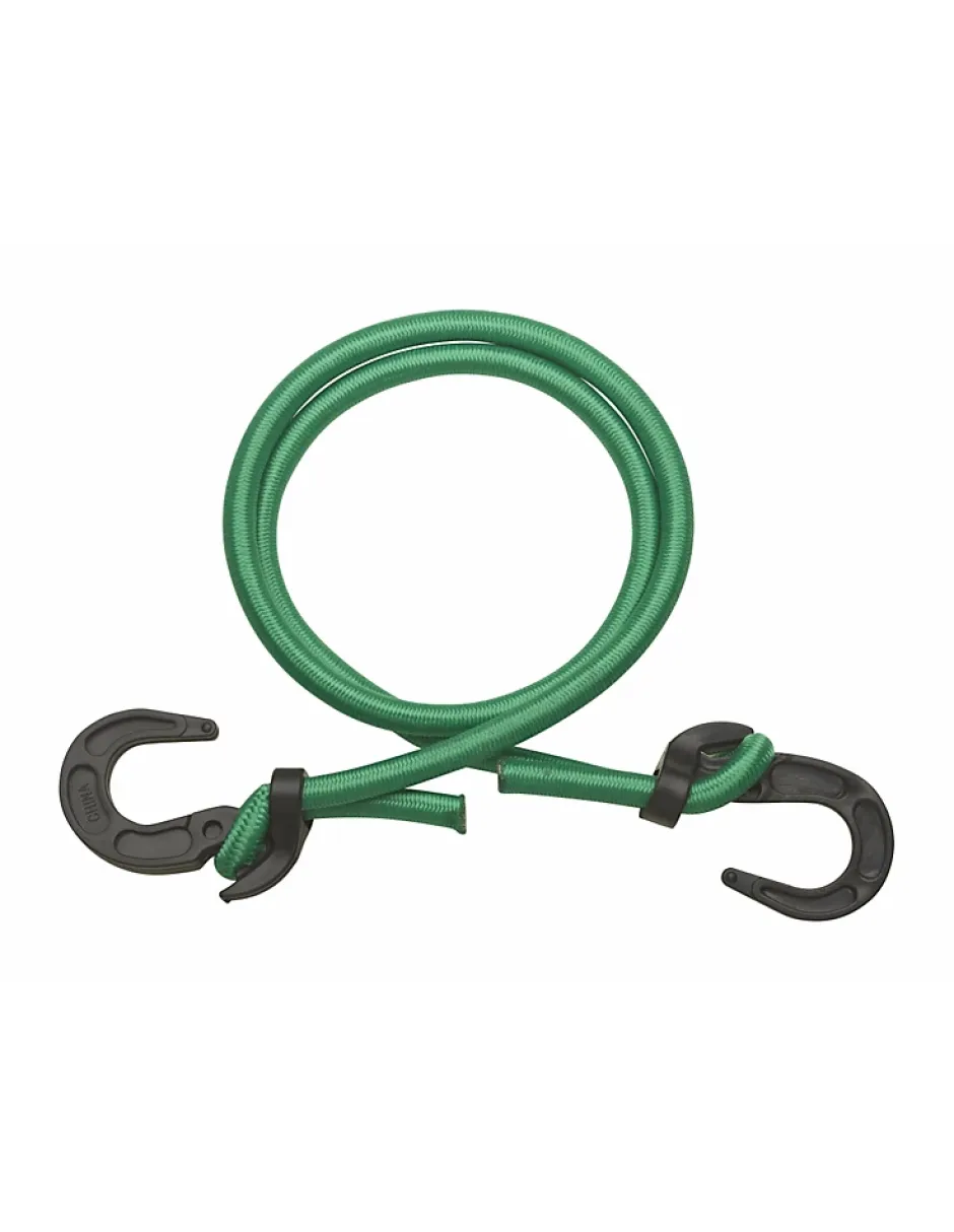 Tendeur ajustable, cordon en caoutchouc de latex plat, crochets en plastique. Vert. Longueur 80cm. Pour arrimage de bagages, vélo, valise…