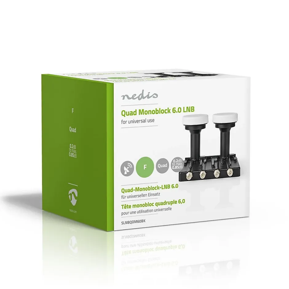 Description du produitMontez cette tête monobloc quadruple 6,0 de Nedis sur des installations nécessitant une puissance et une qualité de signal supérieures. Elle réduit le facteur de bruit. La dernière plage de facteur de bruit est comprise entre 0,2 dB et 0,85 dB.Connectez le monobloc quadruple aux récepteurs satellite par le biais d’un commutateur multiple.Le monobloc offre des signaux sur 4 niveaux : bande verticale haute et basse, bande horizontale haute et basse.Il est adapté à la connexion d’un récepteur satellite à votre antenne parabolique d’un diamètre de 90 à 120 cm.Caractéristiques Faible facteur de bruit : 0,2 à 0,85 dB Convient aux antennes paraboliques de 90 cm à 120 cmContenu de l’emballageMonoblocSpécificationsCommutation à haute bande: 22 kHzCommutation faible bande: 0 kHzConnexion de sortie: 4x connecteur FConsommation de Courant: 0.20 ACouleur: NoirFréquence d’entrée Plage bande basse: 10.7-11.7 GHzFréquence d’entrée Plage bande haute: 11.7-12.75 GHzFréquence de sortie Plage bande haute: 1.100-2.150 GHzGain de conversion: 52-67 dBGain de planéité de bande passante 26 MHz: ± 1Matériau: ABSMatériau: MétalOscillateur local Fréquence bruit de phase: -80 dB c/Hz @ 10 kHz (max.)Plage de bruit: 0.85 dBPlage de température de fonctionnement: -35-70 °CPolarisation croisée: 20 dBPolarité Tension de commutation horizontale: DC 16Polarité Tension de commutation verticale: DC 11Rejet d’image (Min.): 40 dBSortie parasite: -53 dBType d’accessoire satellite: LNBType de convertisseur de modules à f