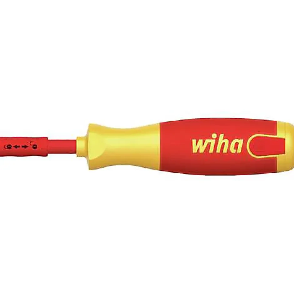 Tournevis porte‑embout Lift‑Up WIHA isolé 1000 V, équipé d’un manche ergonomique bi‑matière en élastomère et d’un magasin intégré à ouverture automatique par deux boutons poussoirs. Porte‑embout 4 mm compatible avec embouts slimVDE pour une sécurité renforcée, verrouillage par bille pour un maintien fiable. Comprend 6 embouts slim VDE de 70 mm isolés 1000 V — fente 3,0 / 4,0 / 5,5 mm, PH1 / PH2, Xeno PZ2, remplaçant l’équivalent de six tournevis isolés pour plus de légèreté et de praticité.