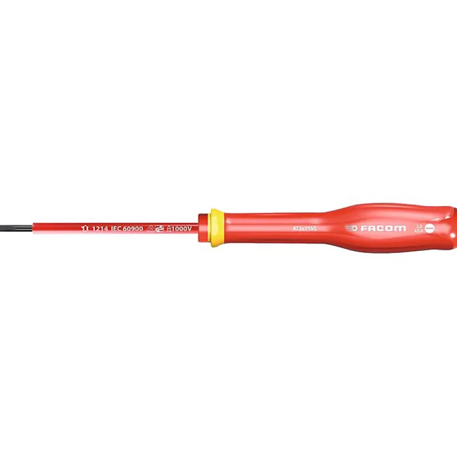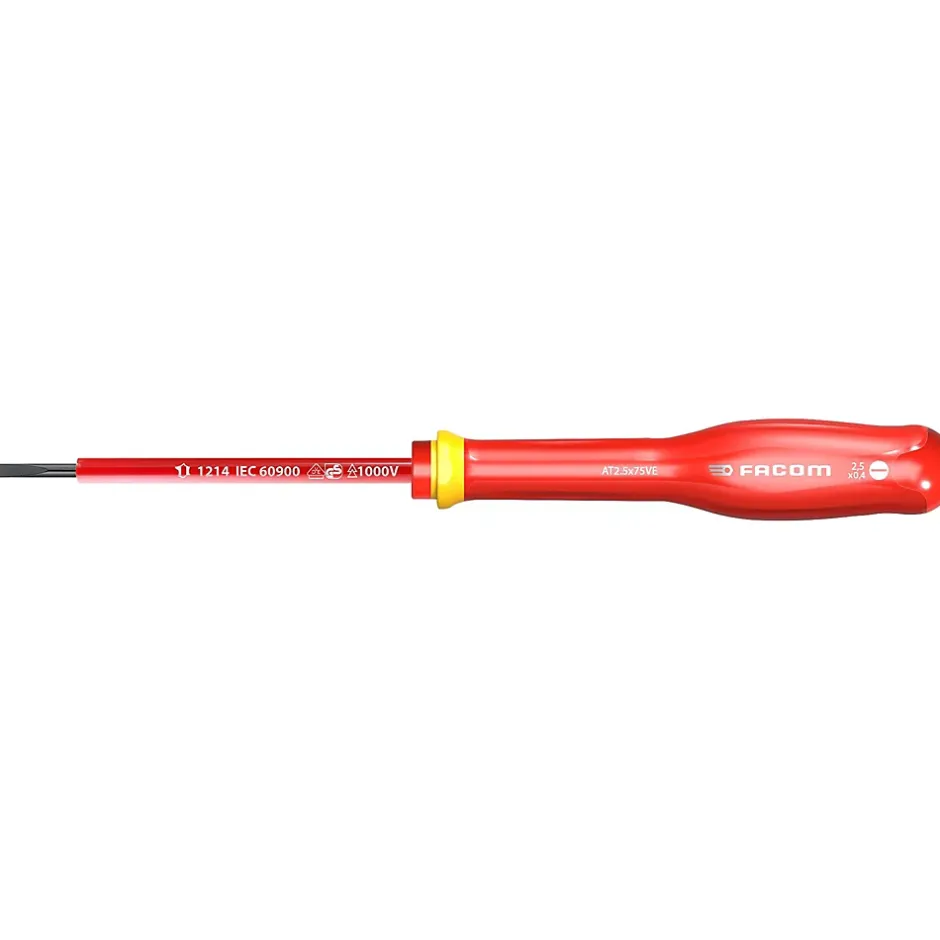 Tournevis isolé FACOM Protwist AT2.5x75VE, conçu pour travaux électriques jusqu’à 1000 V. Pointe 2,5 x 75 mm, longueur totale 178 mm (lame 103 mm). Manche ergonomique bi-matière résistant aux chocs, à l’abrasion et aux produits chimiques, bague isolante jaune, marquage laser. Lame traitée tri-coating (Zinc-Nickel-Chrome) pour une meilleure protection contre la corrosion; pointe usinée CNC pour un ajustement précis. Testé individuellement à 10 000 V pendant 10 s et certifié VDE. Fabriqué en France (Origine France Garantie).