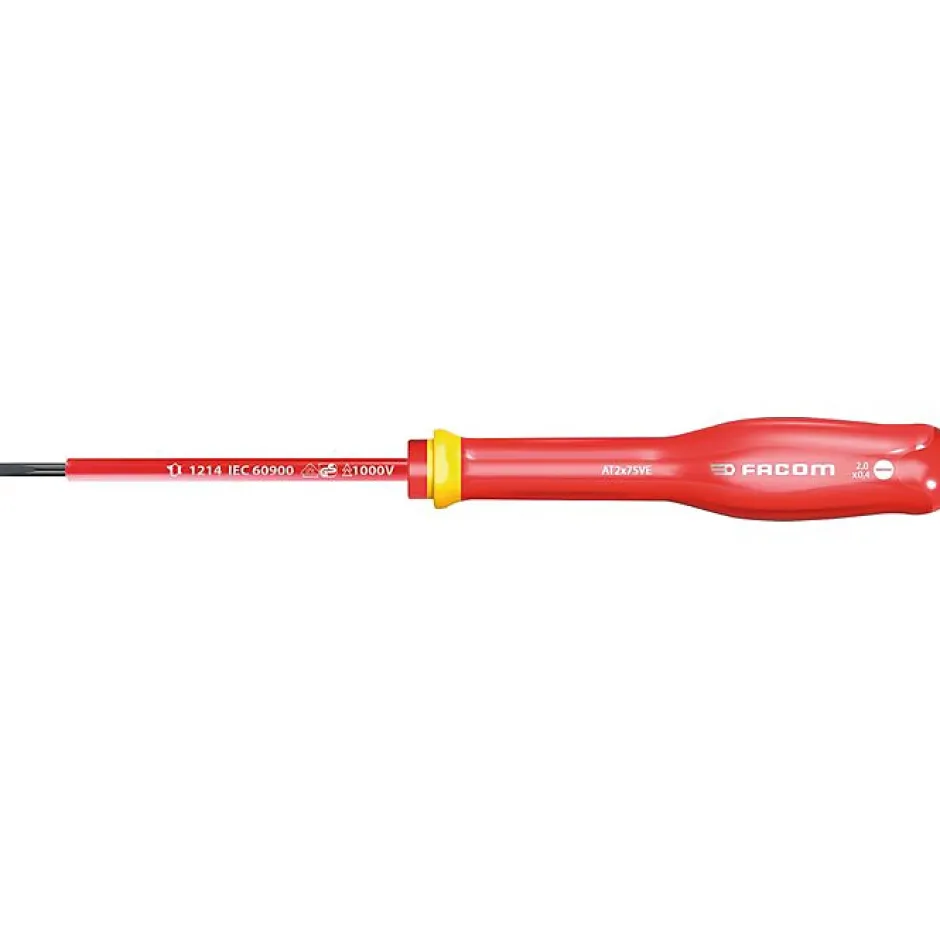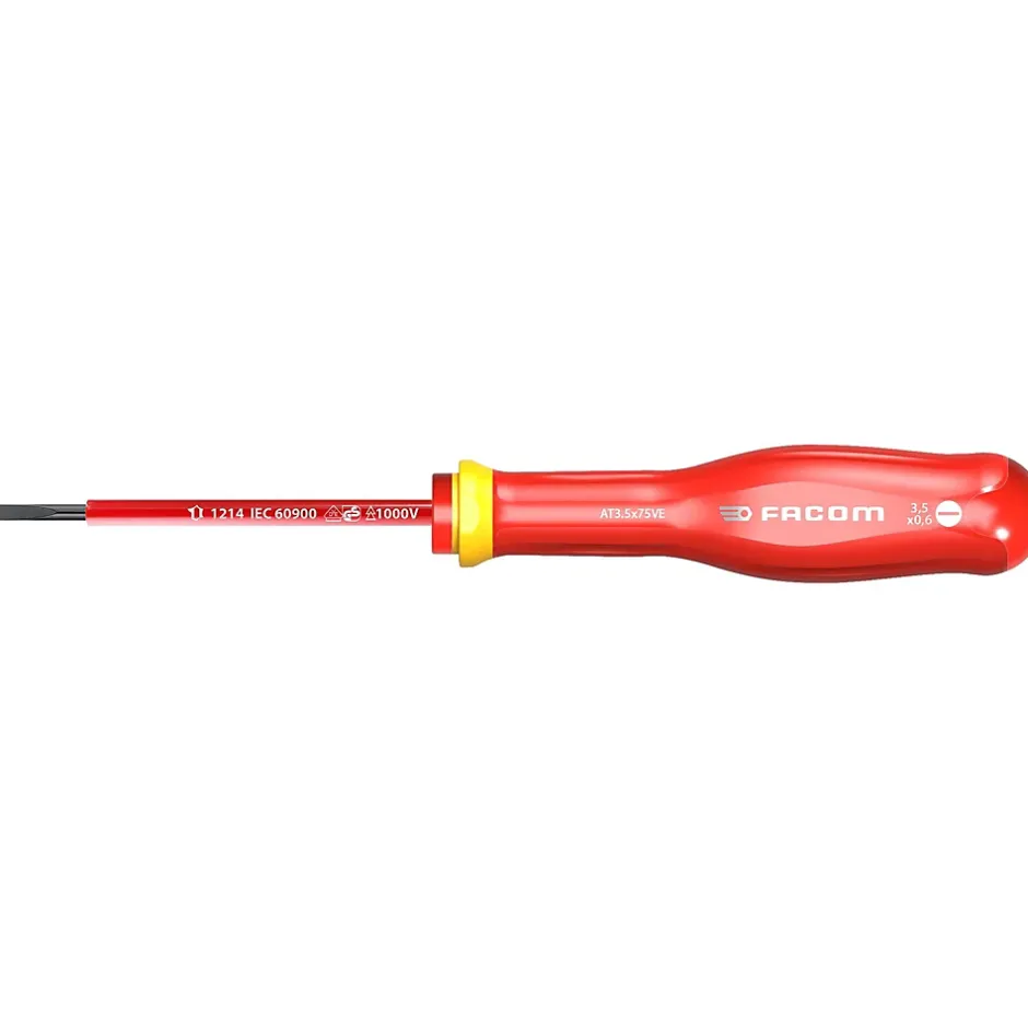 Découvrez le tournevis Protwist isolé de FACOM, idéal pour un travail en cas de tension.Ce produit a reçu le label Origine France Garantie, qui garantit qu’il est fabriqué en France, respecte des critères de qualité et de traçabilité, et contribue ainsi à soutenir l’économie locale.Caractéristiques :Traitement thermique en ligne : + 50% de durée de vie et + 100% de résistance.Matière du manche – Soft Grip : Pour plus de confort et toujours résistant aux produits chimiques.Traitement « tri-coating » de la lame (Zinc-Nickel-Chrome) : 4 fois plus de résistance à la corrosion.Confortable : Ergonomie optimisée du manche : + 10% de couple.Durable : Marquage laser pour une meilleur résistance à l’usure.Usinage des empreintes par commande numérique : Meilleure adaptation de la vis en augmentant le transfert de couple et en réduisant l’usureSécure : Pour votre sécurité, chaque tournevis est testé individuellement à 10000 Volts pendant 10 secondes VDE approuvé, en fin de cycle de fabrication.Spécifications :Taille : 3,5 x 75 mmLame fraisée : 5,5 mm incluseLame de filet : 6,5 > 12 mmLabel Origine France Garantie