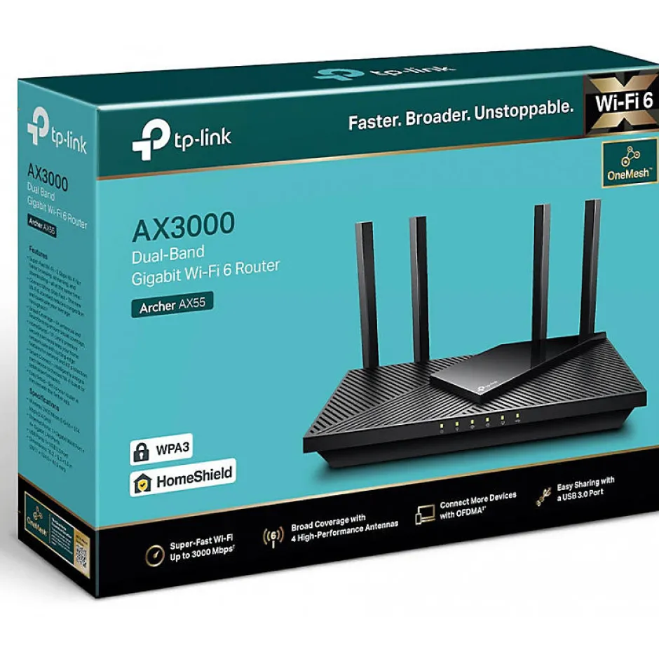 Performances AvancéesLe routeur TPLINK Archer AX55 est conçu pour offrir des performances exceptionnelles grâce à la technologie Wi-Fi 6 (802.11ax). Il atteint des vitesses combinées de jusqu’à 3 Gbps, avec 2402 Mbps sur la bande 5 GHz et 574 Mbps sur la bande 2,4 GHz. Cela permet un streaming fluide et un gaming de haute qualité sans interruption.Sécurité et ProtectionLe Archer AX55 intègre la sécurité avancée TP-Link HomeShield, qui inclut un scanner de réseau en temps réel pour détecter les menaces potentielles, des contrôles parentaux pour gérer le temps d’écran et bloquer le contenu inapproprié, ainsi que la prise en charge du protocole WPA3 pour une sécurité Wi-Fi renforcée.Conception et ConnectivitéCe routeur dispose de quatre ports Ethernet Gigabit pour une connectivité filaire rapide, ainsi qu’un port USB 3.0 pour partager des fichiers ou créer un stockage cloud personnel. La technologie OneMesh permet de créer un réseau Wi-Fi sans interruption dans toute la maison, en associant le routeur avec des extincteurs pour une couverture optimale.Flexibilité et PersonnalisationLe Archer AX55 offre une grande flexibilité avec son support de plusieurs modes de fonctionnement, y compris le mode routeur et le mode point d’accès. Il prend également en charge divers protocoles VPN et offre des fonctionnalités de qualité de service (QoS) pour attribuer des priorités aux appareils favoris.
