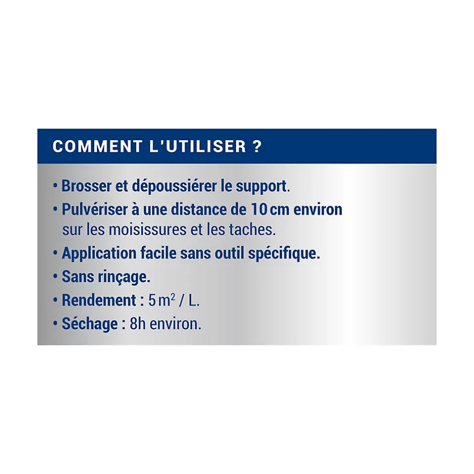 Elimine sans frotter moisissures et micro-organismes sur surfaces intérieures et extérieures. Curatif et préventif, incolore, sans rinçage. Respecte l’aspect et la couleur des matériaux. Agit en profondeur.