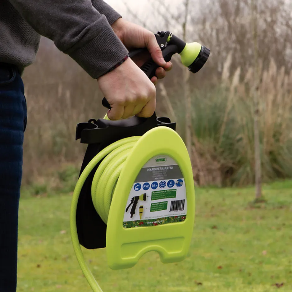 Tuyau de patio en PVC. Connecteur de robinet universel réglable. Pistolet d’arrosage a 6 fonctions. Support d’accrochage. Anse de transport.