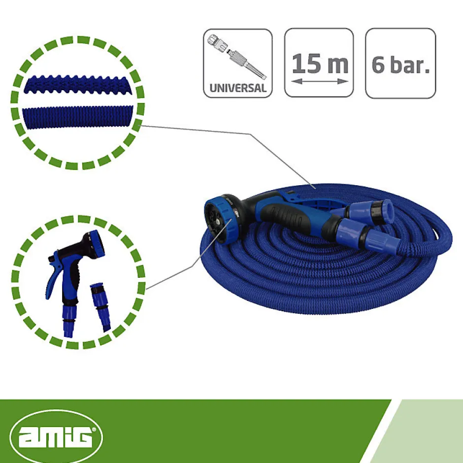 Tuyau extensible en double latex de couleur bleue. Atteint 15 mètres de longueur maximum. Pression maximale jusqu’a 6 bars. Pistolet d’arrosage a 9 fonctions. Avec des accessoires.