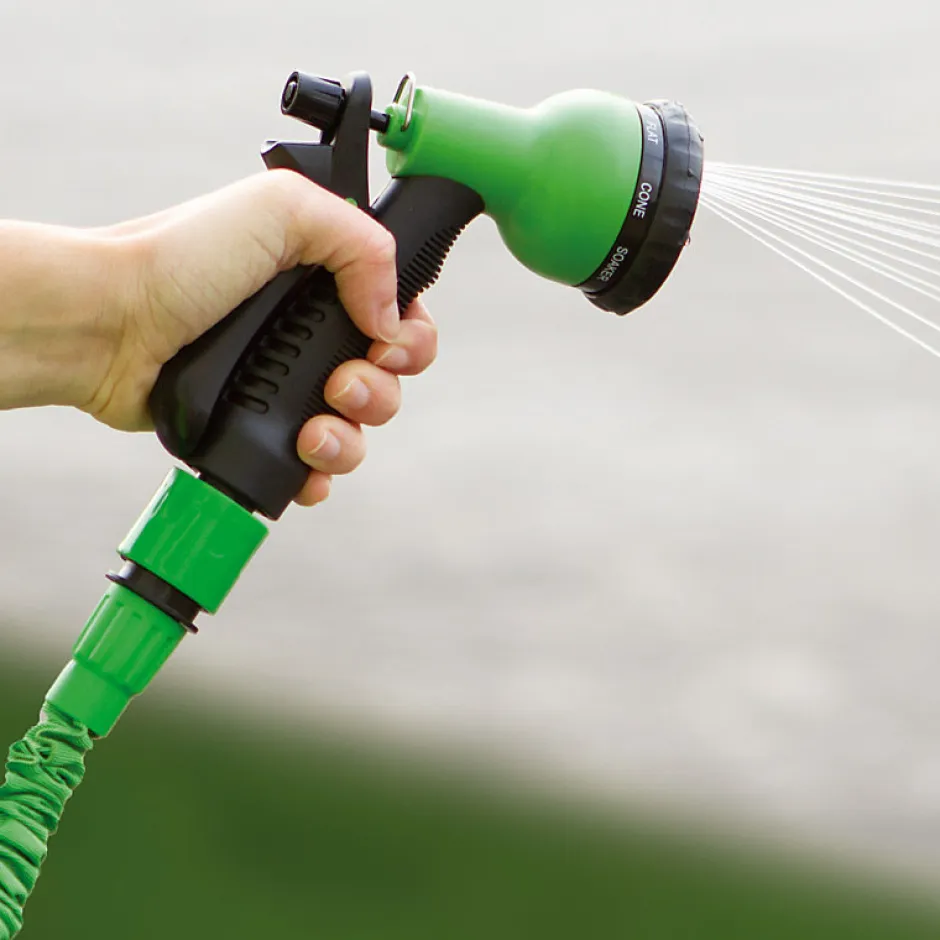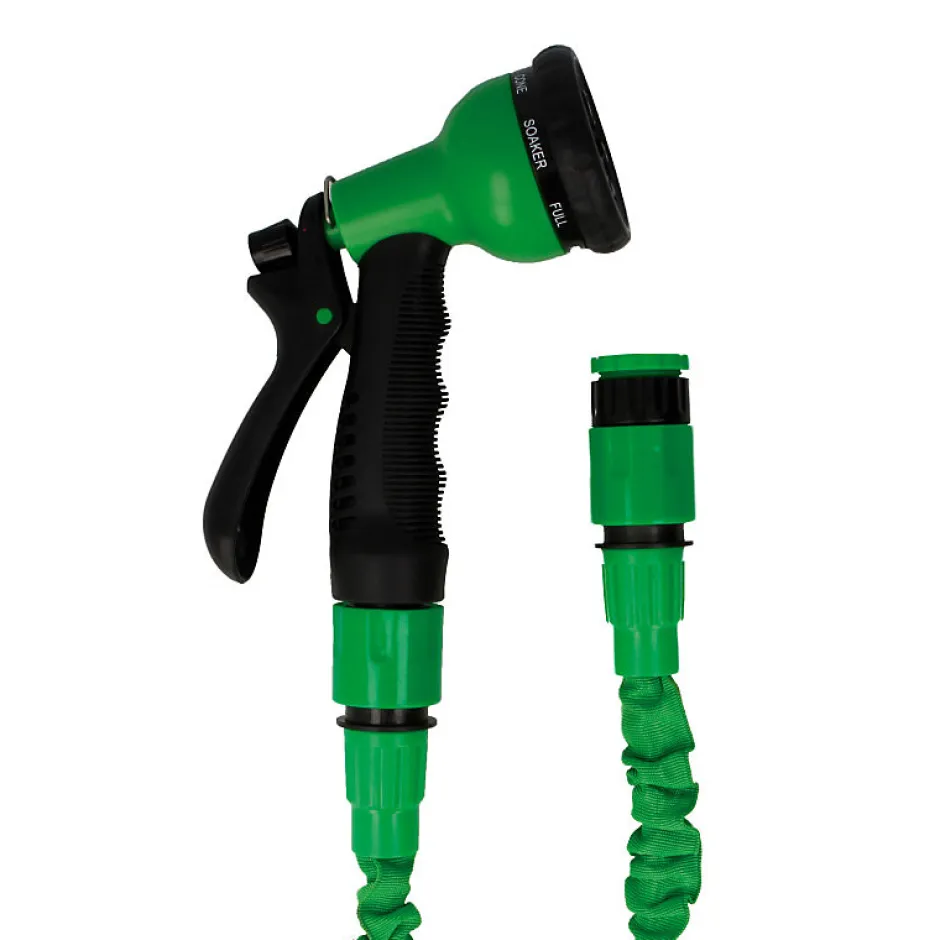 Tuyau extensible en double latex de couleur vert. Atteint 15 mètres de longueur maximum. Pression maximale jusqu’a 6 bars. Pistolet d’arrosage a 8 fonctions. Avec des accessoires.