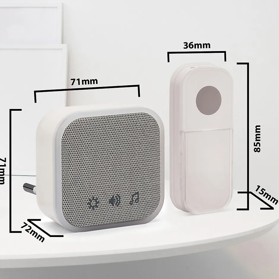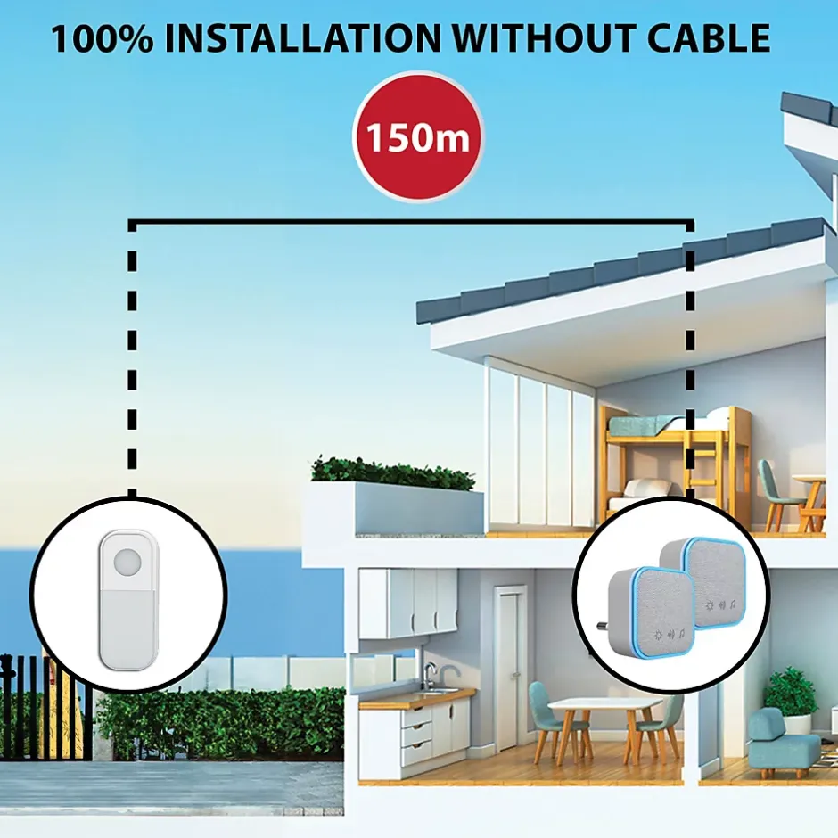 [Portée en champ libre de 150 mètres] La distance entre l’émetteur et le récepteur peut atteindre 150 mètres. La transmission est de 433 MHz, une portée radio suffisante pour installer le carillon sans fil n’importe où dans votre maison, vous assurant ainsi de ne manquer aucun visiteur ou livraison.[36 sonneries et 4 niveaux de volume] Vous pouvez choisir votre sonnerie préférée parmi 36 mélodies différentes. Elles sont toutes belles!. Possibilité de régler le volume sur 4 niveaux.[Avec LED RVB clignotante] Lorsque vous appuyez sur le bouton de la sonnette, en plus d’entendre la sonnerie, une LED colorée clignote autour du récepteur (vous pouvez choisir entre différentes couleurs), ce qui est très visible surtout dans l’obscurité. Pratique également pour les personnes qui entendent mal ou si la télévision est allumée ! Vous pourrez également choisir de laisser la sonnerie + signal lumineux ou juste la sonnerie ou juste le signal lumineux.[Installation facile] Insérez simplement les récepteurs dans les prises électriques (à l’intérieur exclusivement). La sonnette peut être fixée au cadre de la porte avec des vis ou avec du ruban adhésif double face. En plus du porte-nom pratique, la sonnette dispose également d’une lumière rouge qui indique au visiteur que son appel est en cours de transmission. Enfin, la cloche résiste aux projections d’eau : elle convient donc pour être placée sur le pilier du portail ou sous la véranda.[Aucune interférence] le couplage de la sonnette et des récepteurs est très simple et ne nécessite aucune compétence. Surtout, cette combinaison garantit quil ny aura pas de perturbations de fréquence avec dautres appareils sans fil à proximité.: