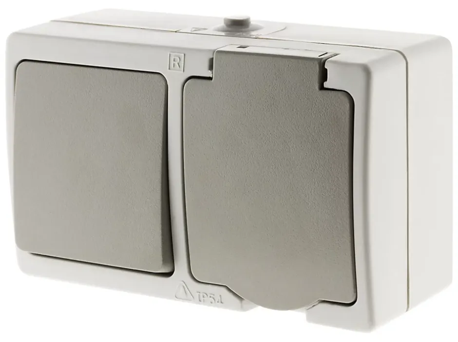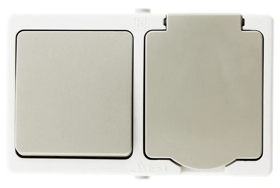 Appareillage mixte horizontal. Couleur(s) : gris. Combiné interrupteur va-et-vient + prise 2P+T. Indice de protection : IP54, protégé contre la poussière et les projections d’eau. Prise : 16 A, 250 V, puissance maximale 3680W sous 230V. Interrupteur va-et-vient : 10A, 250V, puissance maximale 2300W sous 230V. Système de protection enfant intégré. Câblage rapide et simplifié. Certifié NF et CE