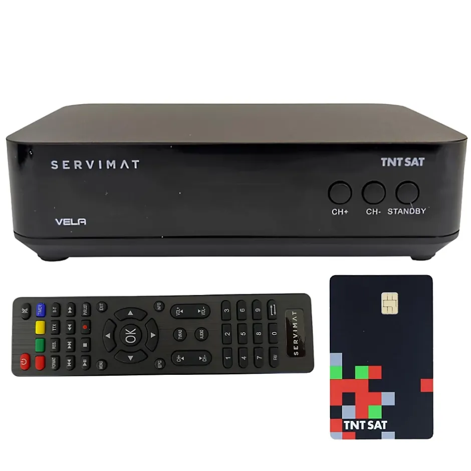Description du produit : Servimat VELA HDLe Servimat VELA HD est un démodulateur satellite conçu pour recevoir gratuitement les chaînes de la TNT via le satellite Astra 19.2°E grâce au service TNTSAT. Ce terminal de réception offre une qualité d’image en haute définition et une utilisation intuitive grâce à son afficheur et sa télécommande ergonomique.Livré avec une carte TNTSAT, il permet d’accéder immédiatement aux programmes sans abonnement, garantissant une expérience TV fluide et sans contraintes. Sa conception compacte et son alimentation externe en font un équipement idéal pour une installation à domicile ou en mobilité (camping-car, caravane, etc.).Caractéristiques techniques :Type de réception : TNT gratuite par satellite via TNTSAT (Astra 19.2°E)Affichage : Écran en façade pour une navigation simplifiéeAccessoires fournis :1 carte TNTSAT (valable 4 ans pour l’accès aux chaînes gratuites)1 bloc d’alimentation1 télécommande ergonomique2 piles AAA1 notice d’installationSorties vidéo : HDMI, Péritel (compatibilité avec anciens téléviseurs)Compatibilité : Adapté aux installations fixes et mobiles (camping-cars)Alimentation : Bloc externe 220VLe Servimat VELA HD est un choix parfait pour ceux qui souhaitent profiter des chaînes de la TNT en toute simplicité, avec une installation rapide et une compatibilité optimale.