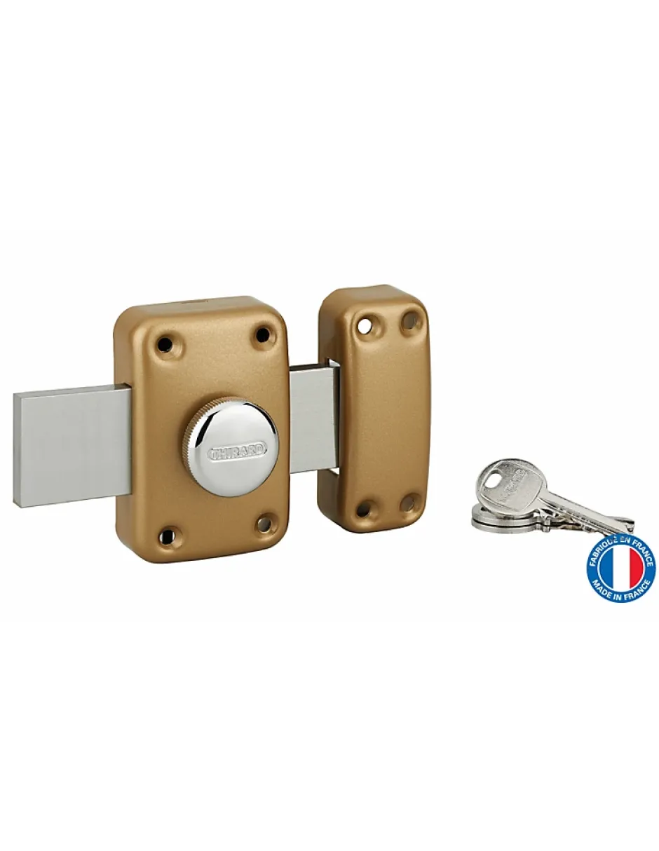 Les points Clés :Verrou cylindre à boutonVerrou Apache Epoxy OrVerrou pour porte de garageHauteur du coffre 90 mmLargeur du coffre 60 mmCylindre Diamètre 23 mmCylindre Longueur 40 mmPêne de 160mmCylindre Laiton à 5 goupilles3 Clés Plates crantéesNiveau de Sécurité :